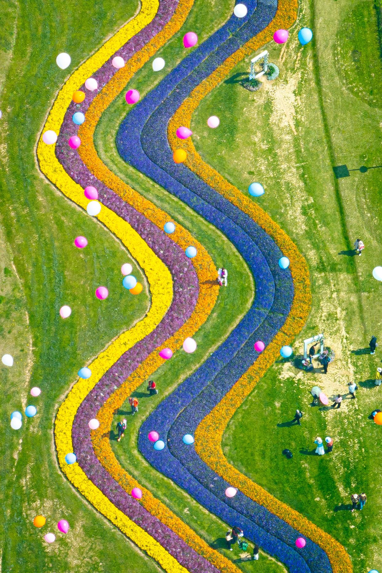 3月14日,游客在江苏省高邮市湖上花海景区赏花游玩(无人机照片)。新华社发(孟德龙摄)