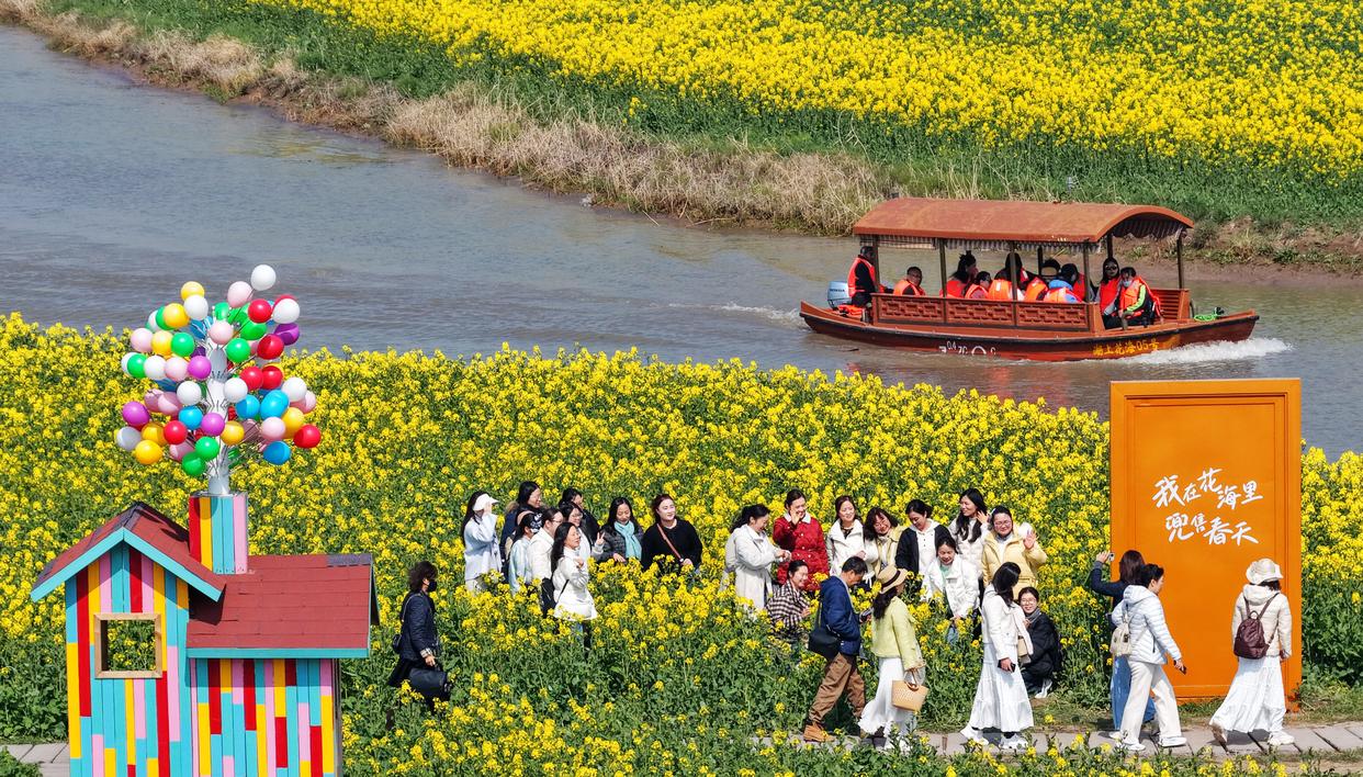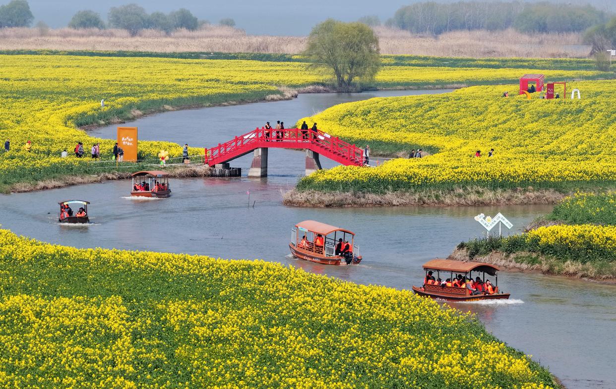 3月14日,游客在江苏省高邮市湖上花海景区乘船赏花(无人机照片)。新华社发(孟德龙摄)