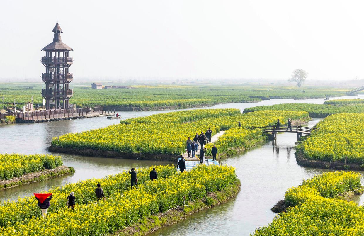 3月14日,江苏省兴化市千垛景区开园迎客,游客在景区内赏花游玩。新华社发(汤德宏摄)
