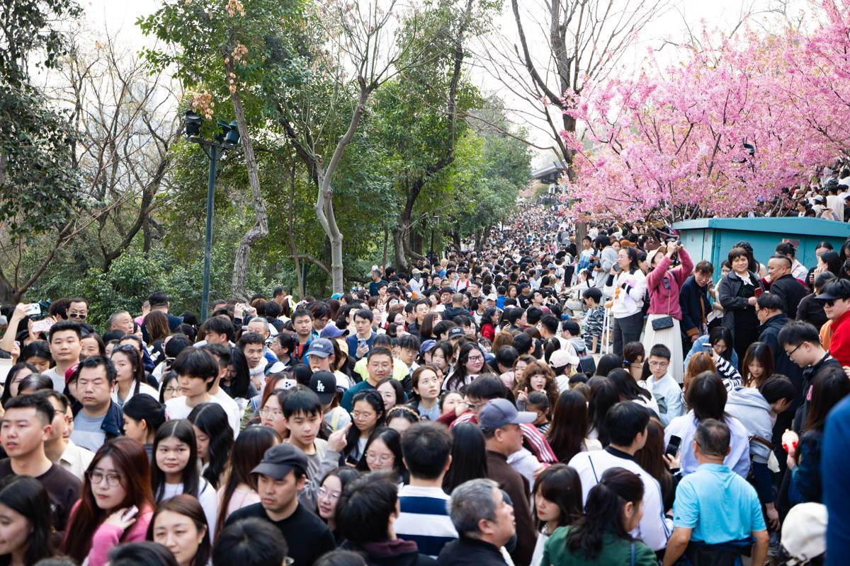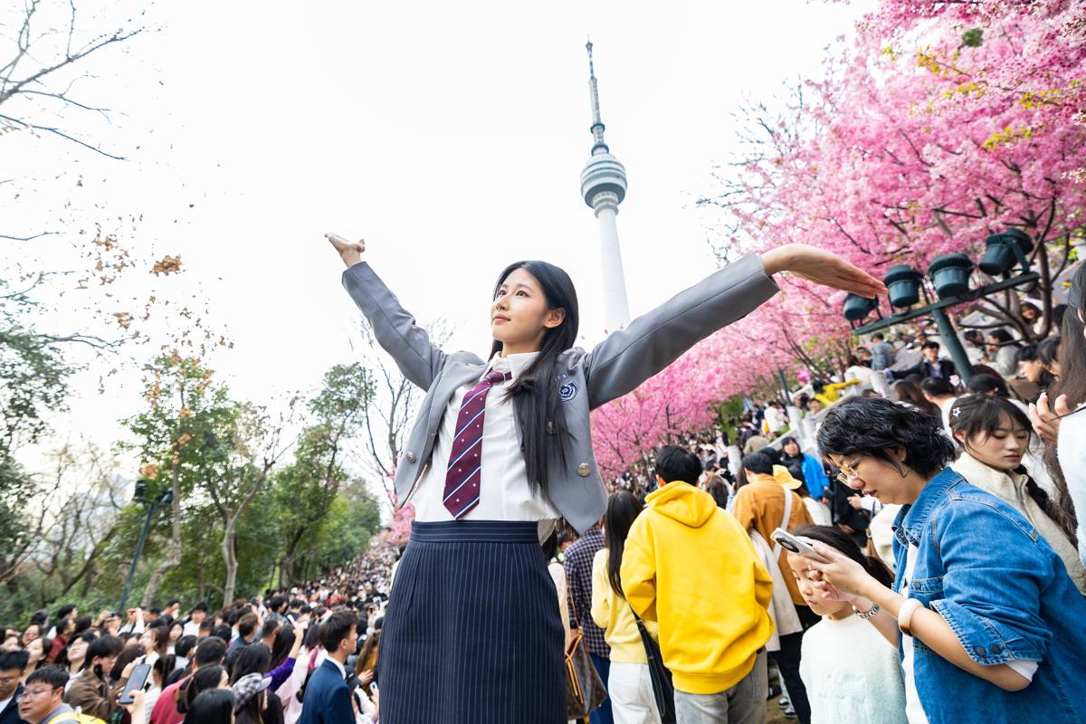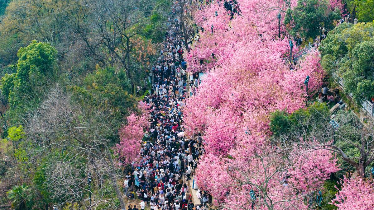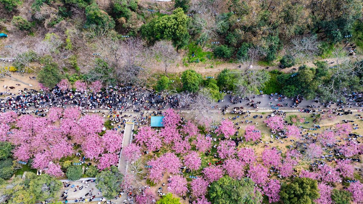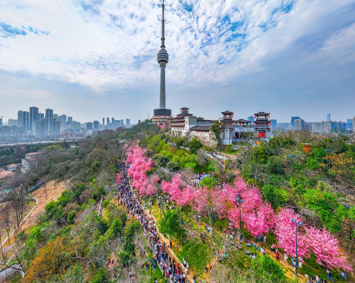 2026年3月14日,武汉龟山公园樱花迎春盛放,吸引大批市民游客前来踏春赏花。现场人流如织,十分火爆!(湖北日报全媒记者何宇欣摄)