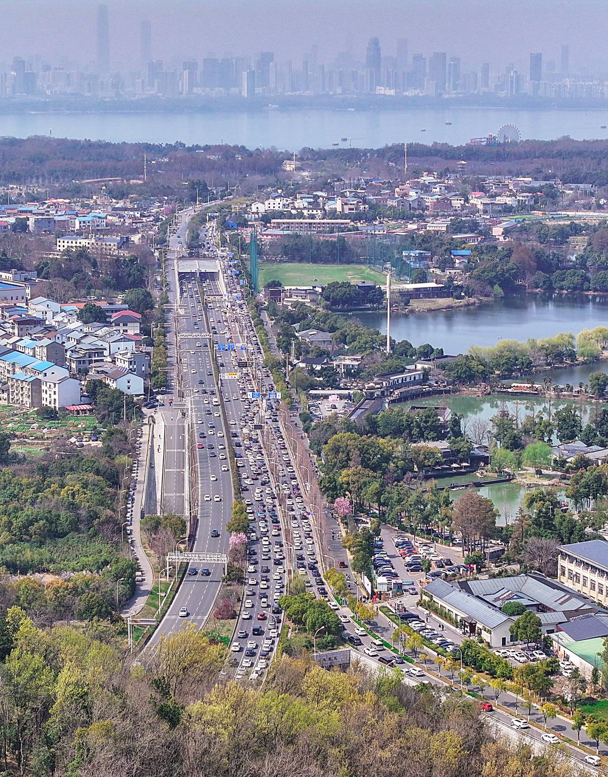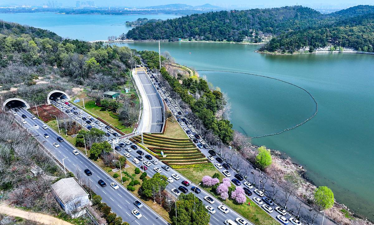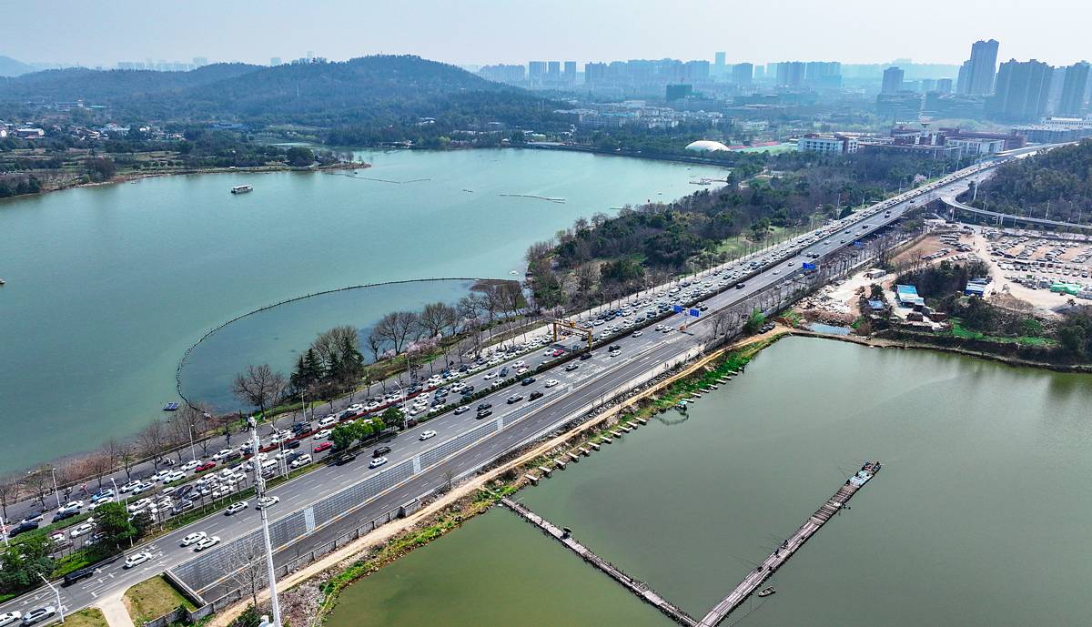 据了解,当日武汉阳光明媚,市民利用周末纷纷走出家门,到东湖磨山、东湖樱园、马䯃山森林公园踏青赏花。导致鲁磨路、喻家湖北路、东湖东路、东湖南路、植物园路等拥堵显著。(湖北日报全媒记者朱熙勇摄)