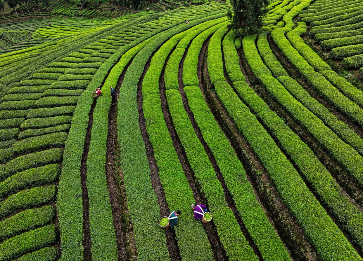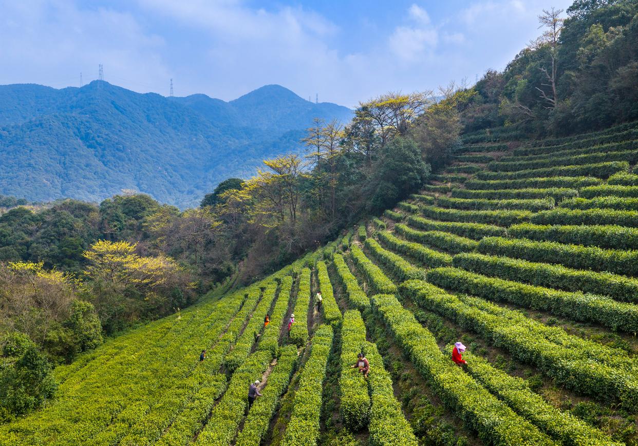 3月13日,浙江省宁波市北仑区大碶街道新路村的茶农在茶园采摘春茶(无人机照片)。新华社发(胡学军摄)