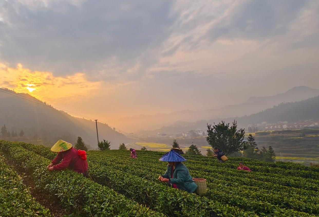 3月15日,在四川省乐山市沐川县利店镇,茶农在茶园采摘春茶。新华社发(孔胜摄)