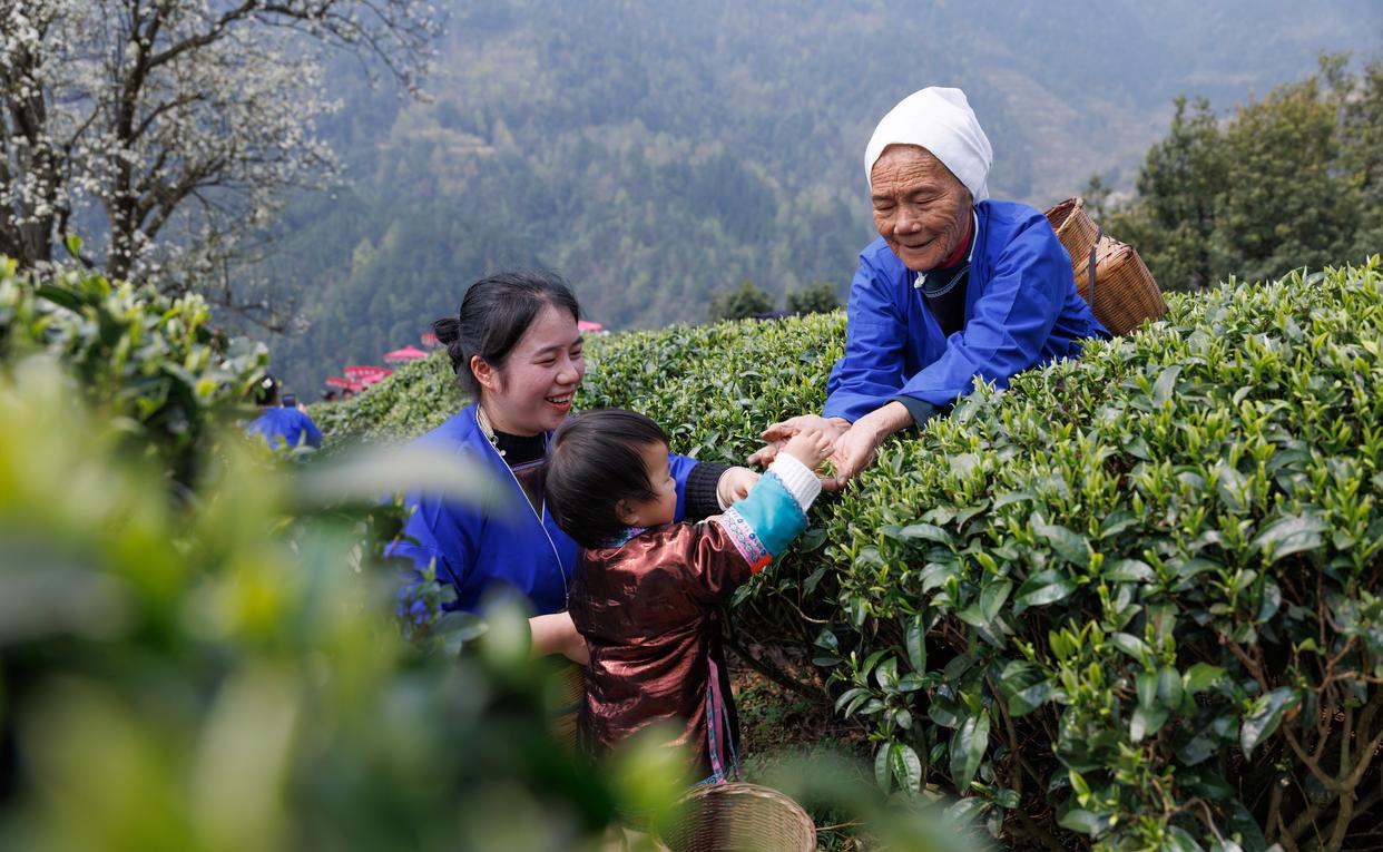 3月14日,在广西壮族自治区柳州市三江侗族自治县八江镇归令村,当地一户人家祖孙三人在茶园里采摘春茶。新华社发(粟勇主摄)