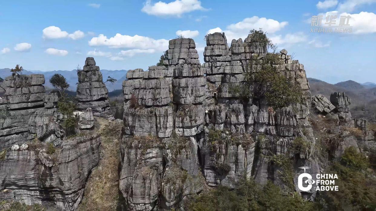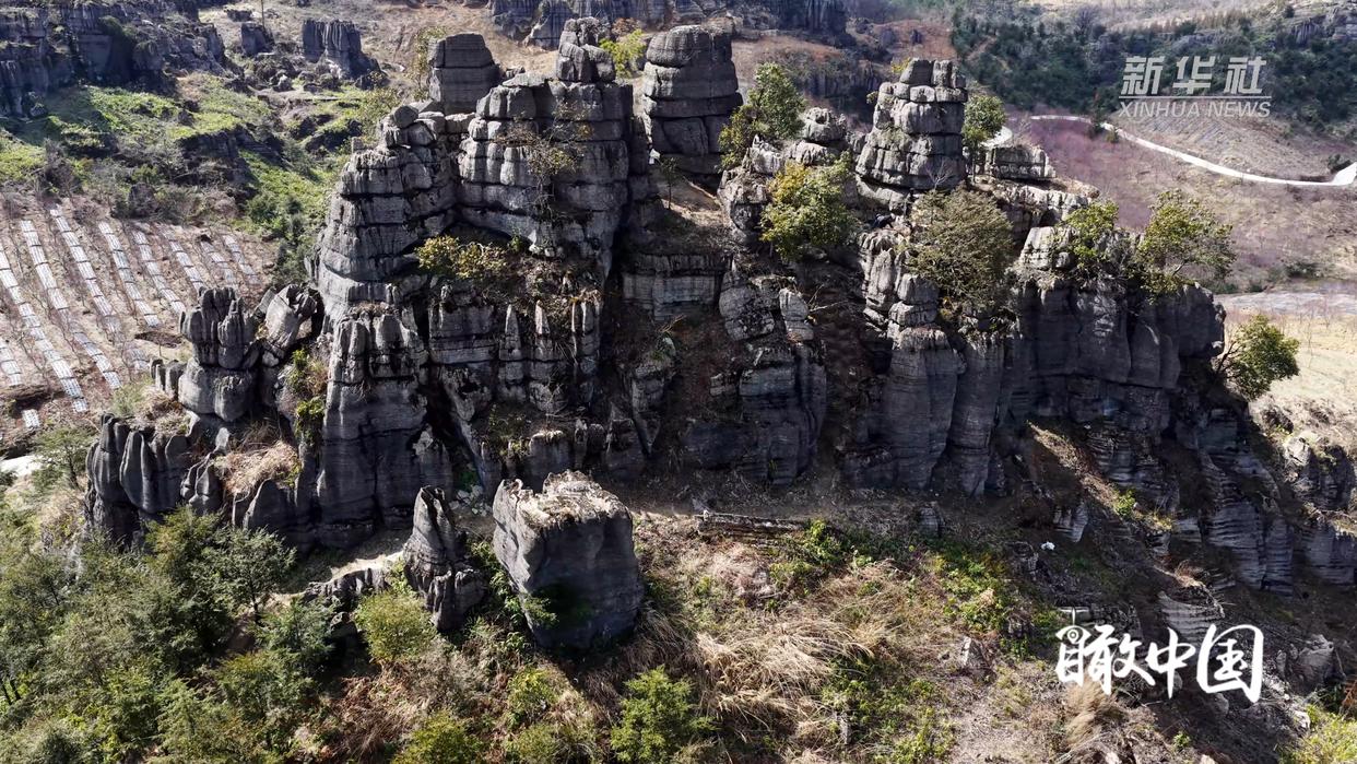 连绵的石林如列阵的巨人,巍然屹立于山巅。形态各异的石柱、石笋、石崖遍布其间,岩石表面沟壑纵横,清晰的层理镌刻着漫长岁月风雨侵蚀的痕迹;翠绿的灌木与藤蔓自石缝间顽强探出,为这片苍劲石林点缀上鲜活春意,勾勒出一幅雄浑而秀美的春日图景。