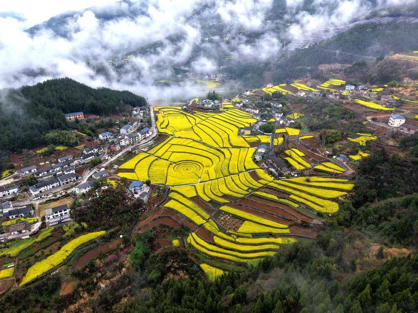 龙池村因仙侣山山脊蜿蜒如游龙,山中洗墨池、莲花池、青草池三池相连得名,享有“仙山神水,神秘龙池”之称。眼下,1800亩油菜花沿梯田层层铺展,从山脚蜿蜒至山腰,金色花浪与白墙黛瓦的农房相映成趣,勾勒出现实版“富春山居图”。