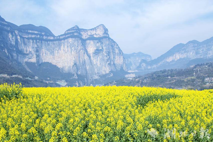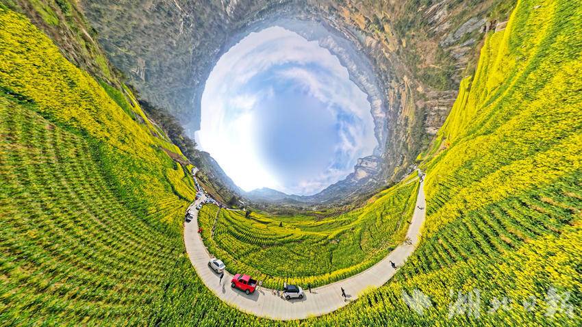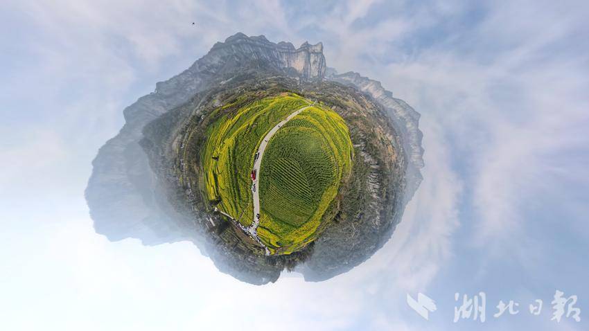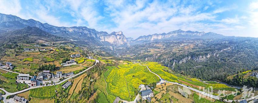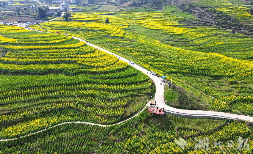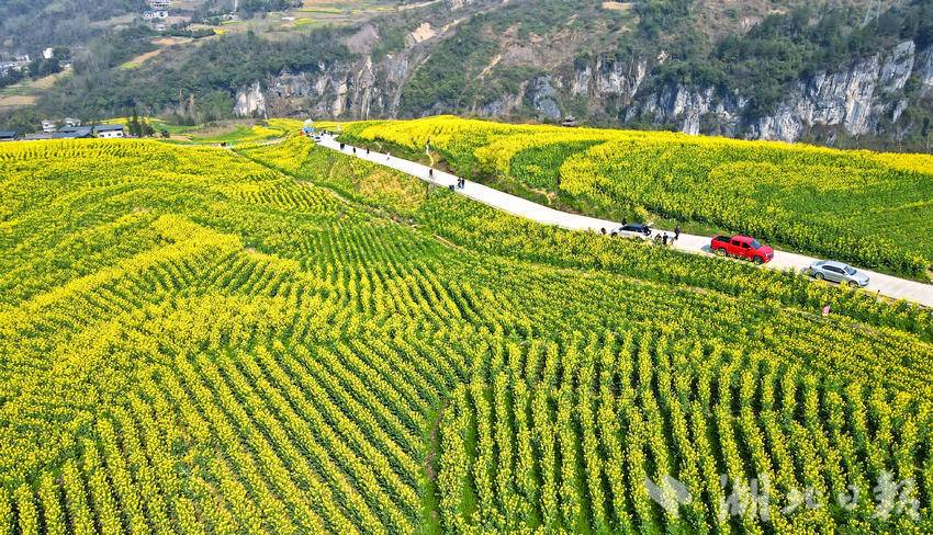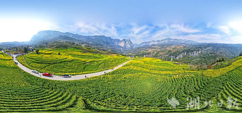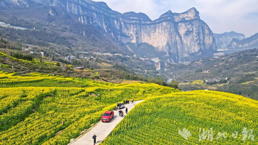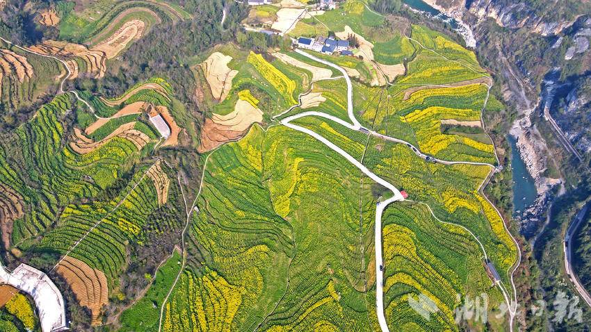 初春时节,恩施市屯堡乡田凤坪村的油菜花竞相绽放,连片金黄与绝壁、山川、河流、公路、民居相映成景,绘就一幅生机盎然的春日画卷。