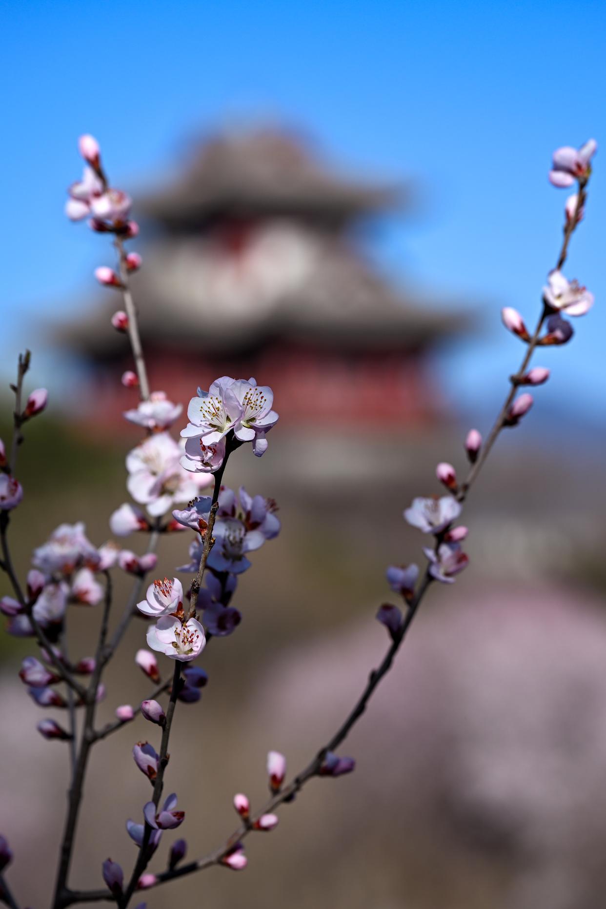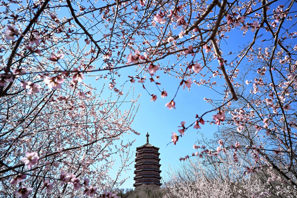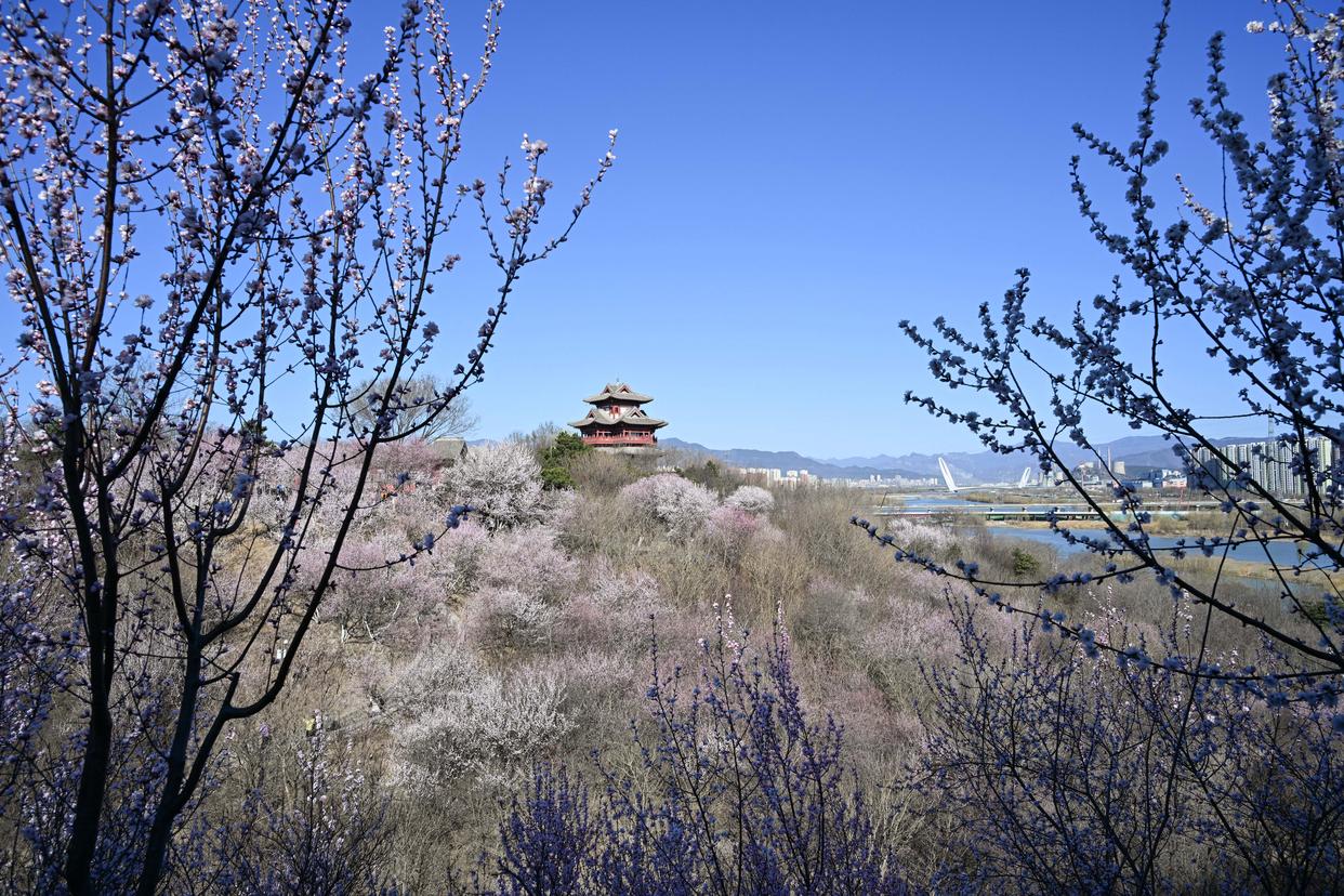近日,北京园博园桃花谷山桃花次第绽放,吸引游客前来赏花踏青。
