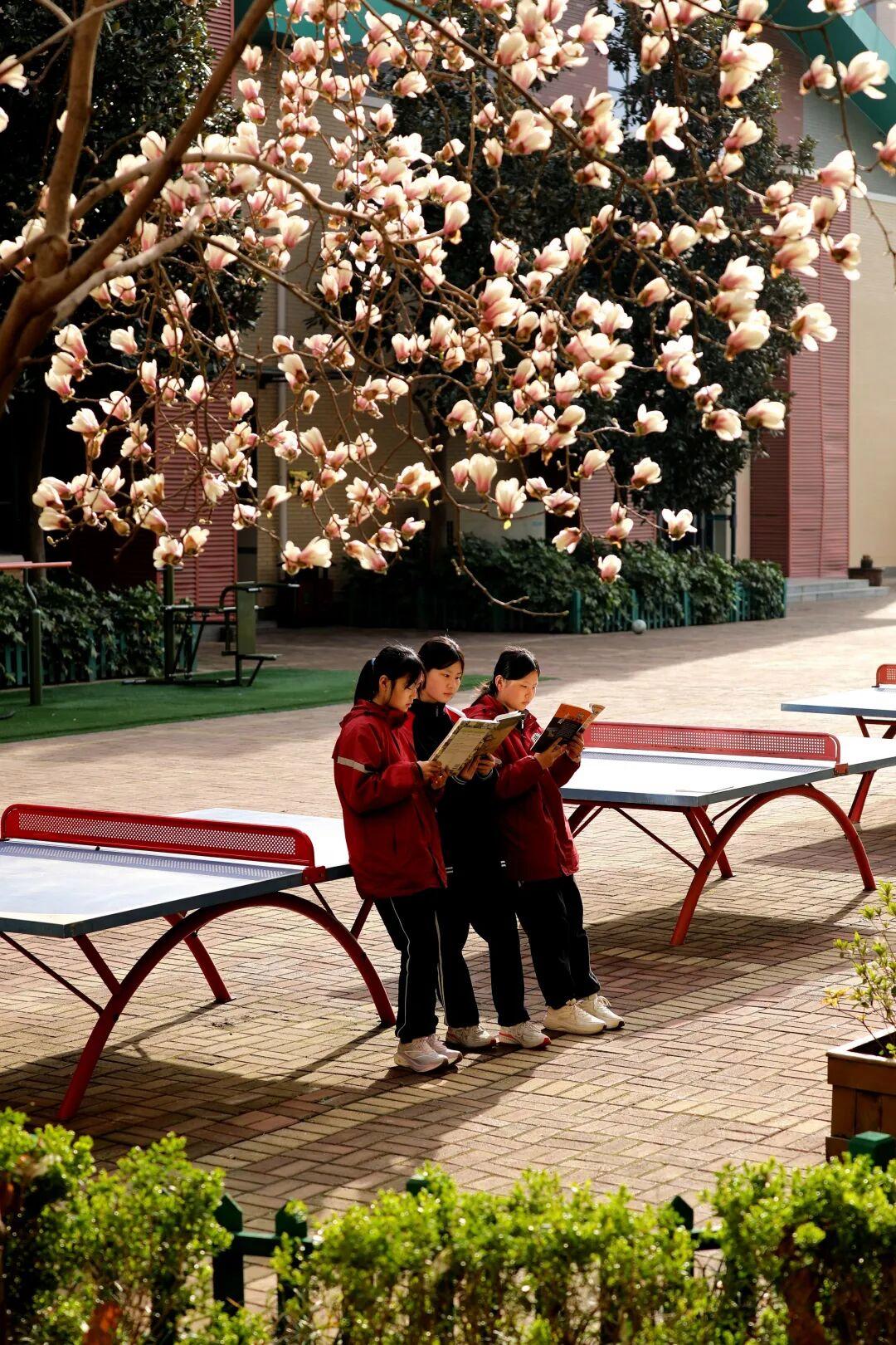 玉兰树下,春光正好,几名同学正在看书。花香四溢,书香正浓,这是玉兰树下的青春序章。@追梦人