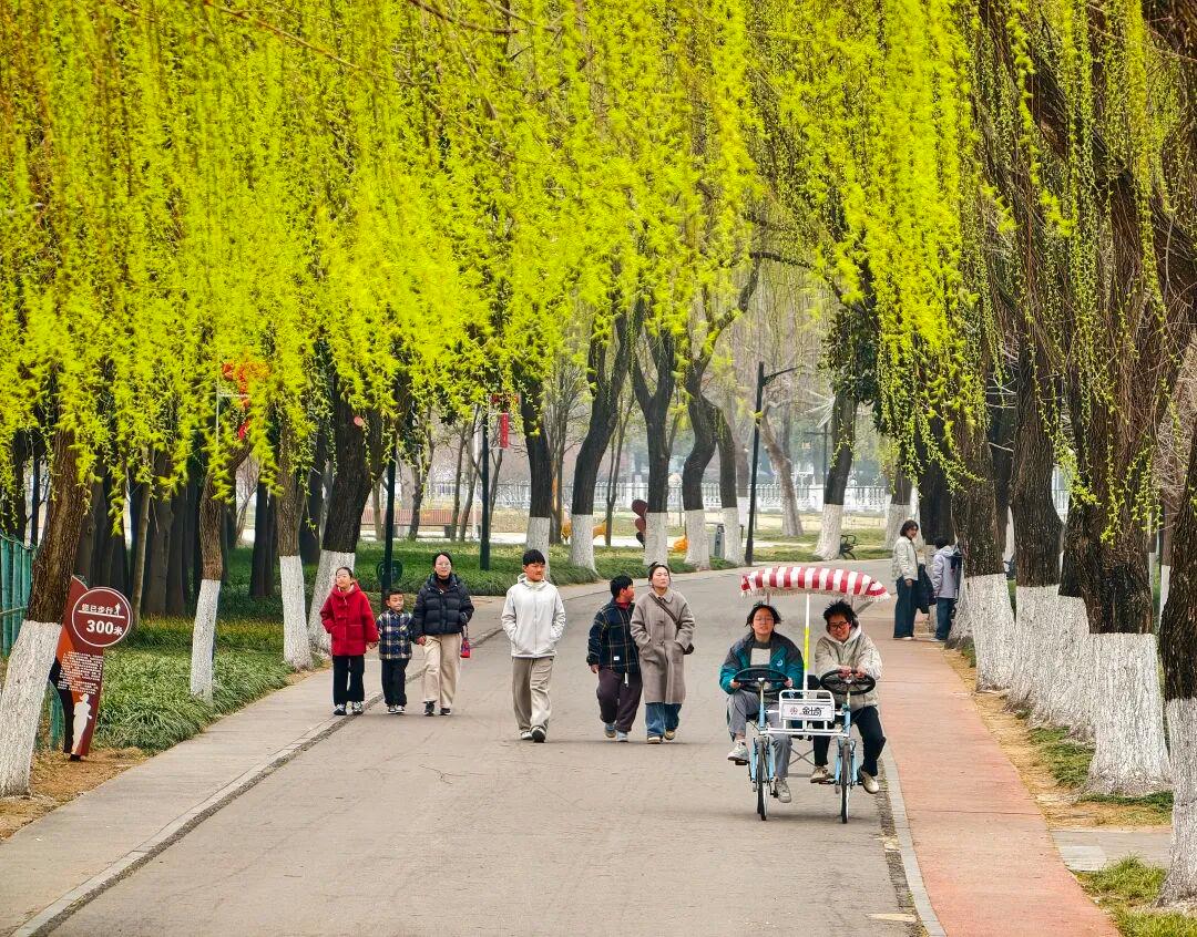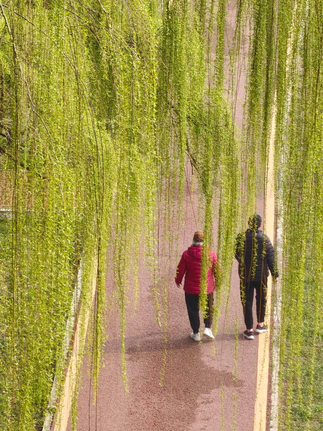 长长的河堤旁排排杨柳发出新绿,市民们正在散步,享受着春的美好。@张文光