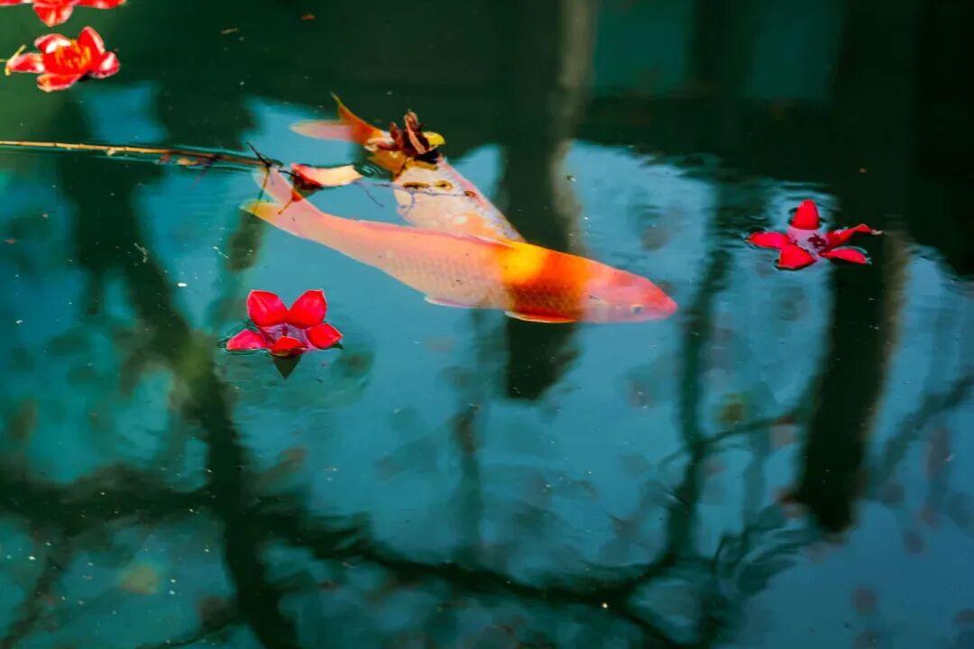 水池里的锦鲤与落在水面上的木棉花。@TimingHuang