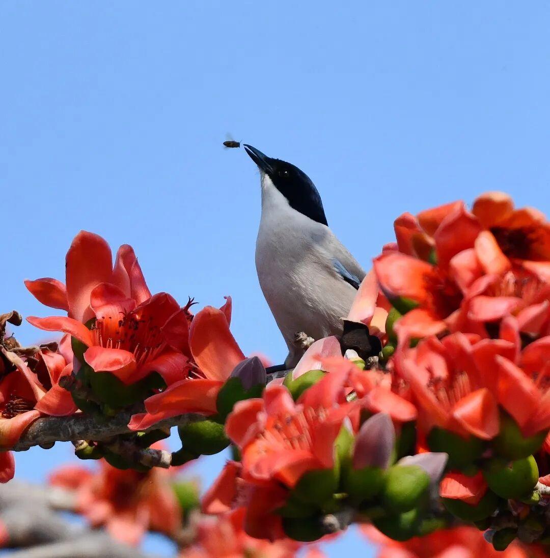 木棉花开,鸟儿和蜜蜂前来采蜜。@红木棉