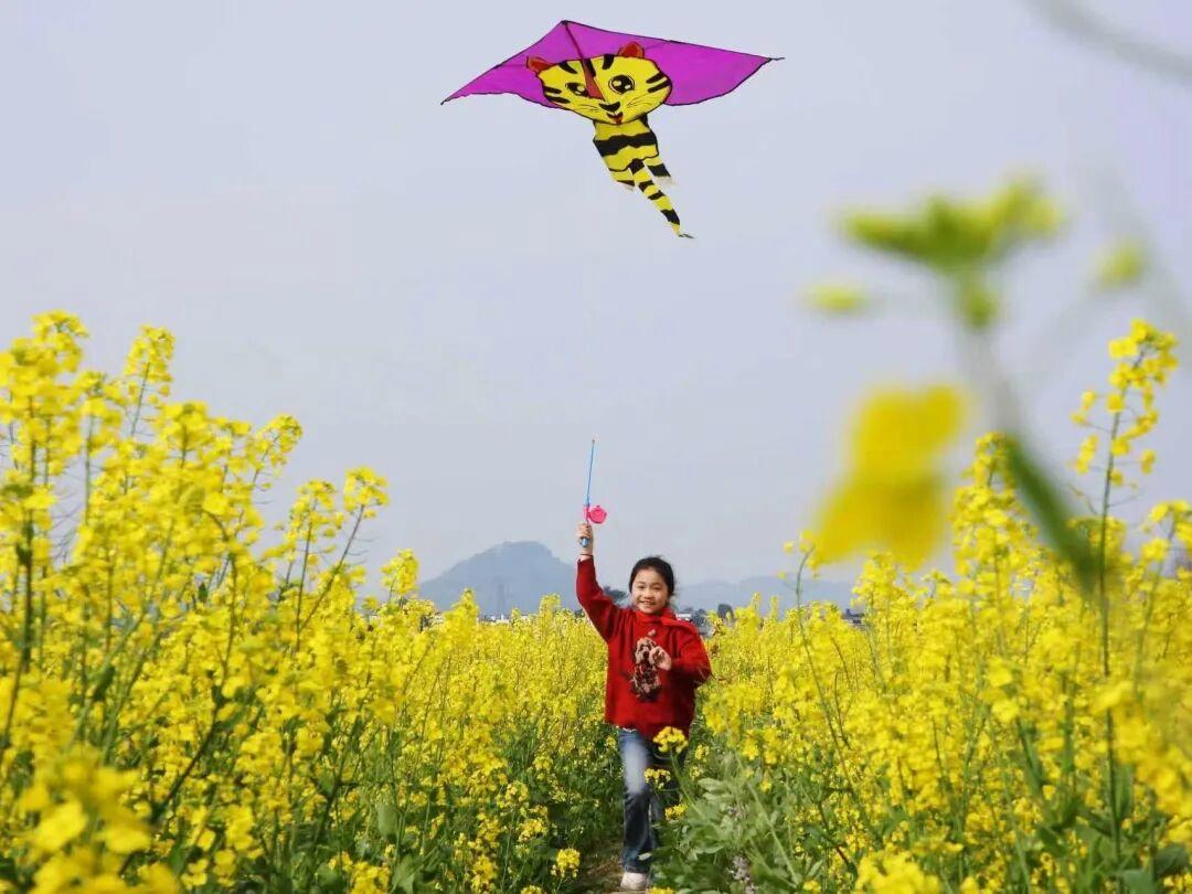 一名小学生在油菜花海中放风筝。@蓝山
