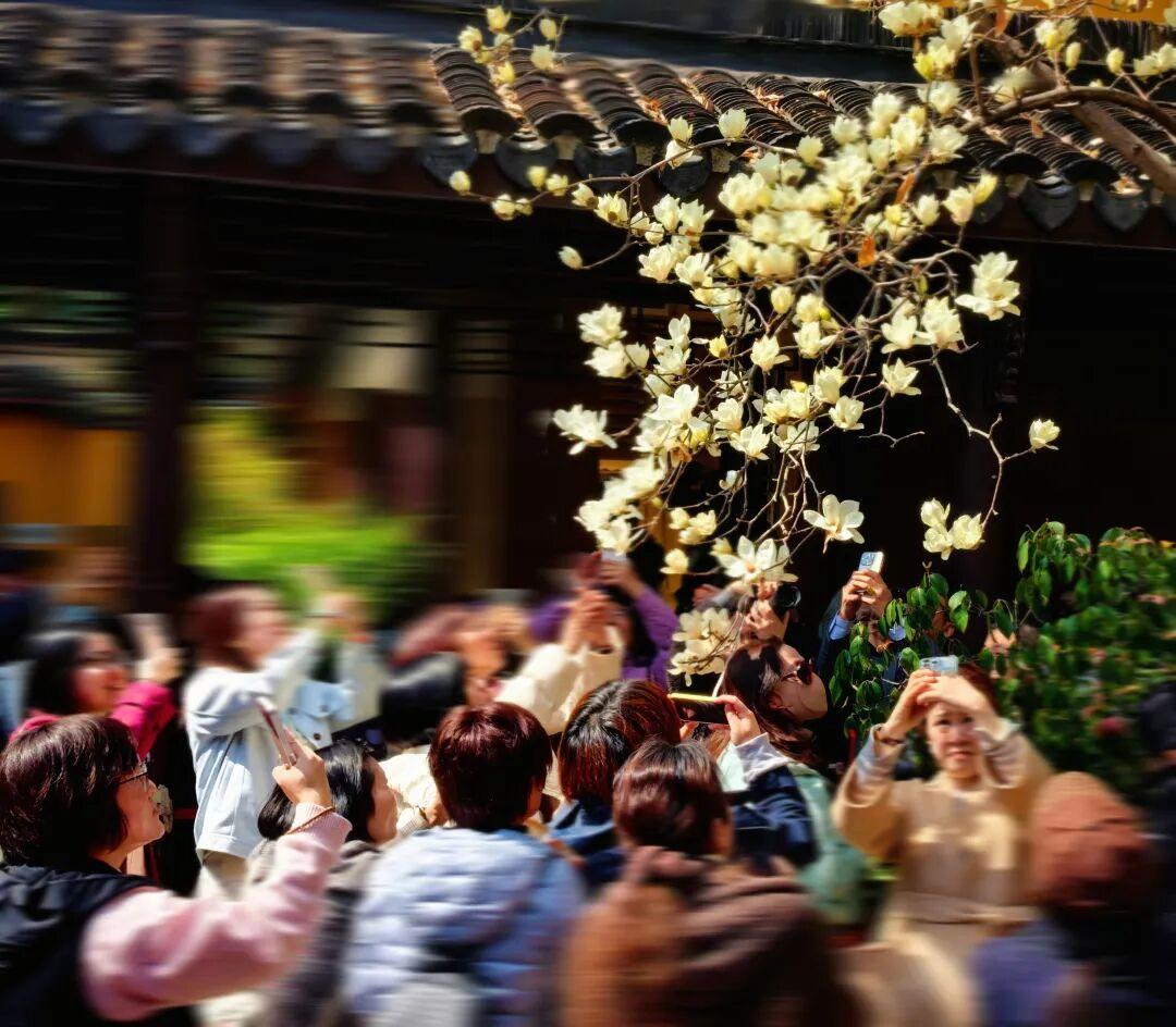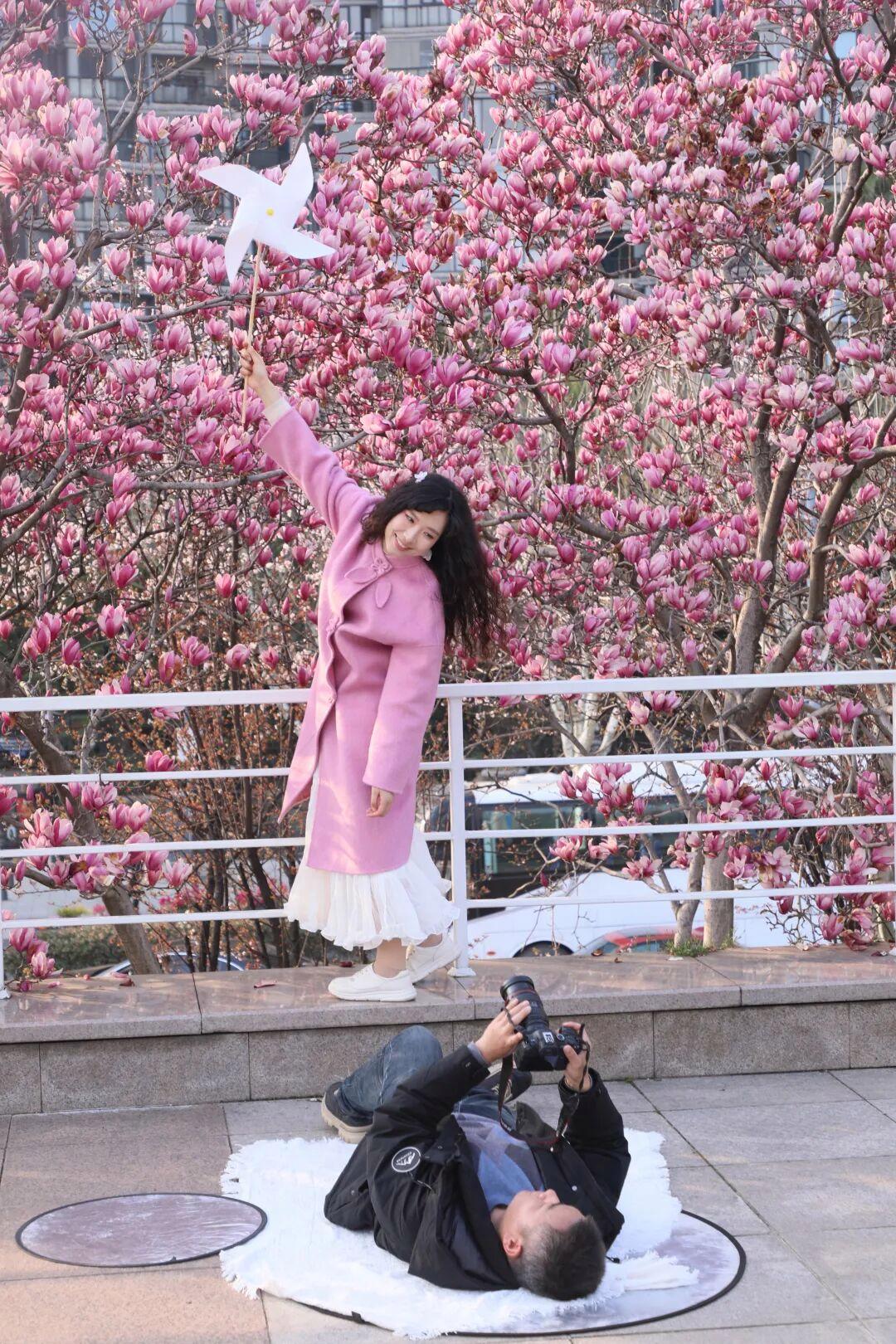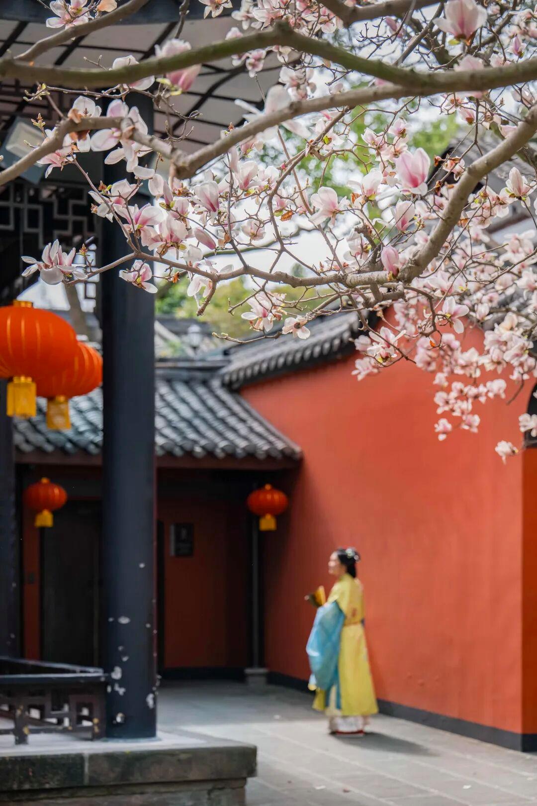成都武侯祠内,玉兰花如期盛放。粉白的花瓣与朱墙黛瓦相衬,古装女子的身影点缀其间,勾勒出独特的春日诗意。@巧