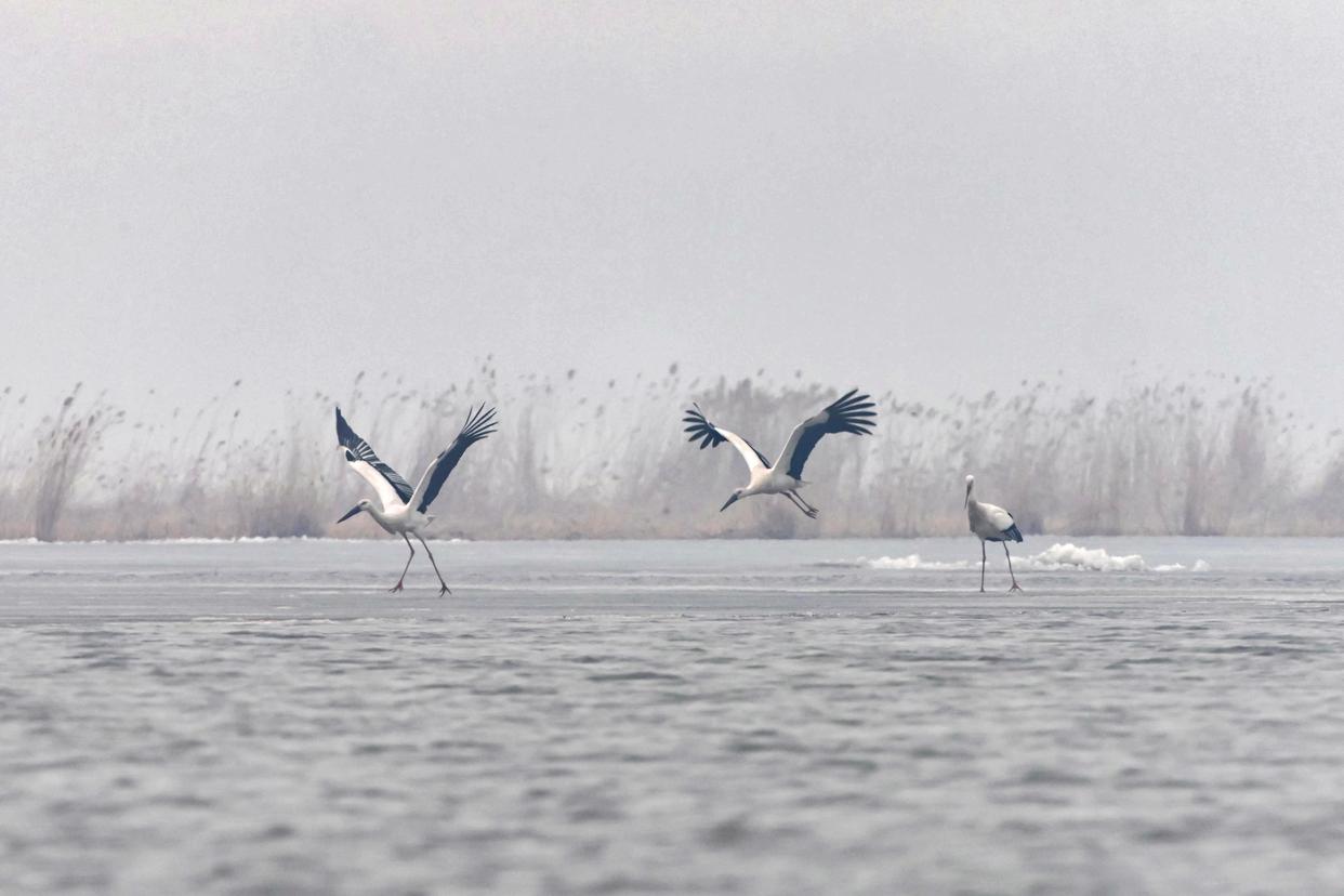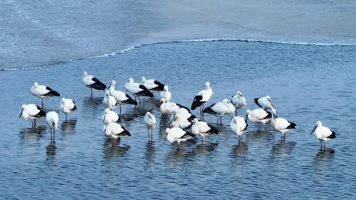3月19日,东方白鹳在松花江哈尔滨段一处水域栖息、觅食(无人机照片)。新华社发(杨威 摄)