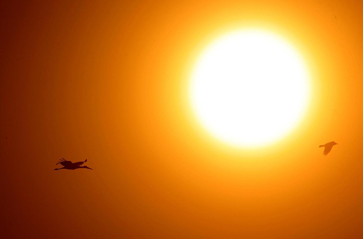 3月19日,一只东方白鹳(左)在黑龙江省哈尔滨市的松花江畔迎着朝阳飞翔。新华社发(张树 摄)