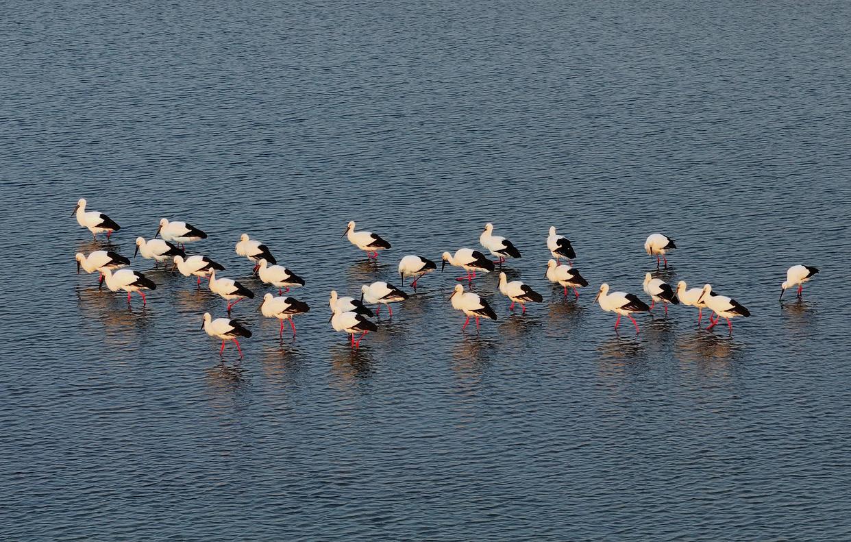 3月19日,一群东方白鹳在松花江哈尔滨段一处水域觅食(无人机照片)。新华社发(张树 摄)