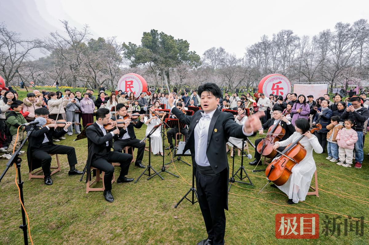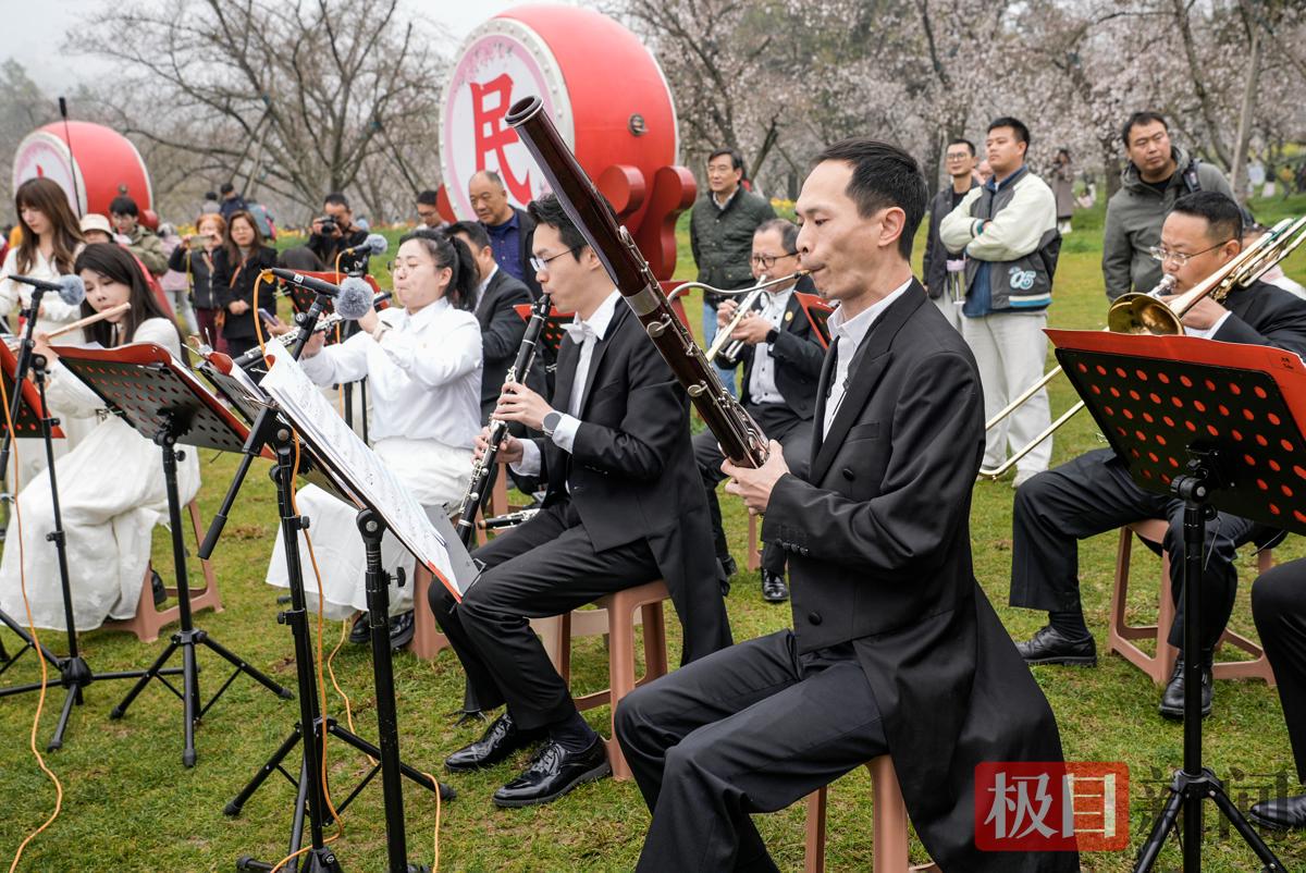 在现场,乐团演奏了《春节序曲》《茉莉花》《花好月圆》《卡门序曲》《春之声圆舞曲》《我和我的祖国》等十首乐章,在乐团演奏、观众合唱《我和我的祖国》时,音乐的芳华,在樱花丛中回响,激动人心,许多原本只是看花路过的游客,也纷纷停下脚步,驻足听完整场音乐会。