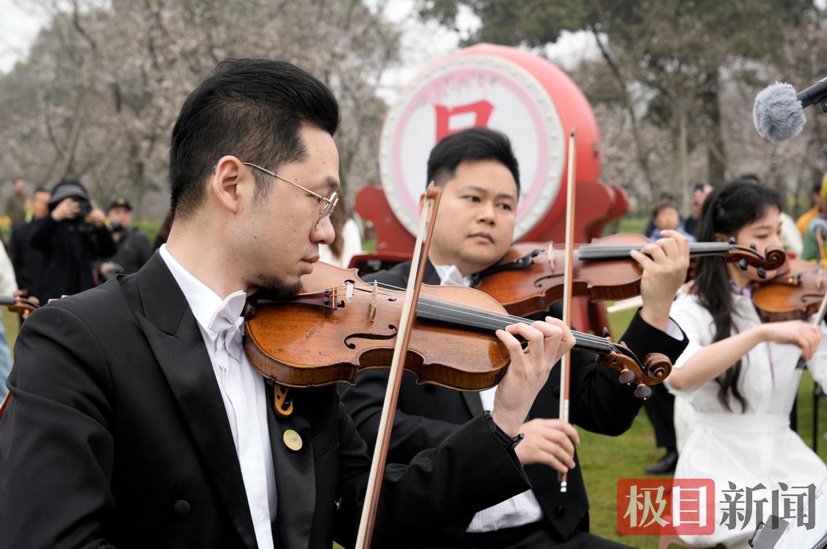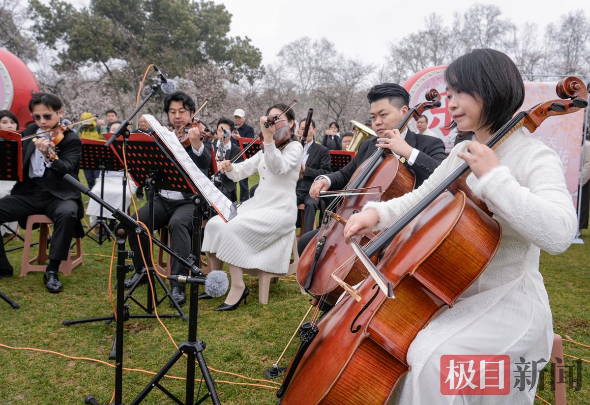 3月21日,在武汉东湖樱园中央草坪,武汉爱乐乐团举办的交响音乐会,在落“樱”缤纷的赏樱潮中浪漫奏响,优雅的春之乐章,让市民徜徉在樱花与音乐的海洋中,尽情拥抱春天的美好。在武汉东湖樱园,游客惊喜和优雅的交响乐、烂漫花海撞个满怀。