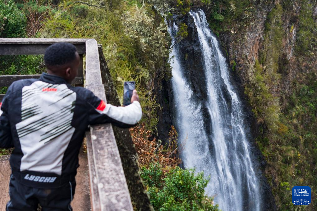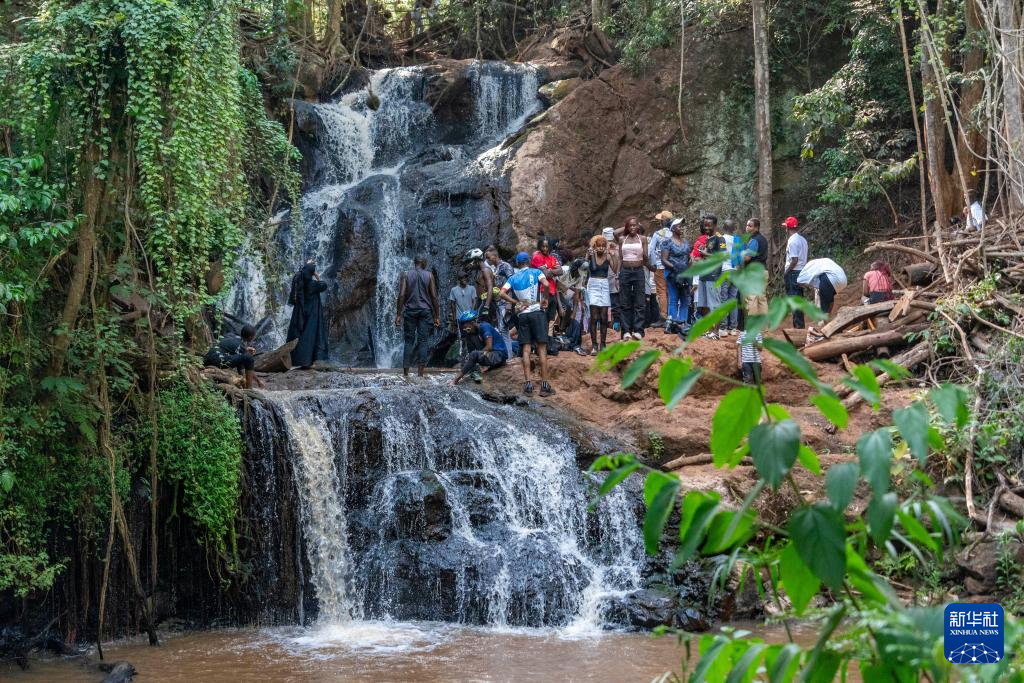 1月25日,在肯尼亚首都内罗毕,人们在卡鲁拉森林中的一处瀑布前休闲。新华社记者 谢剑飞 摄