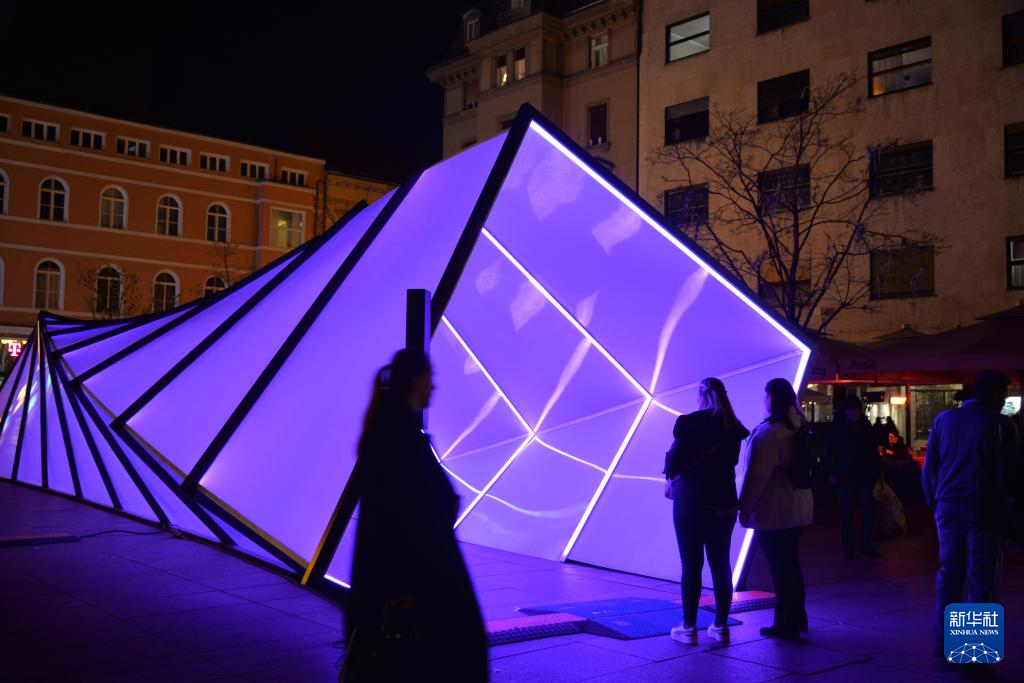 3月18日,人们在克罗地亚首都萨格勒布市中心广场欣赏灯光艺术装置。