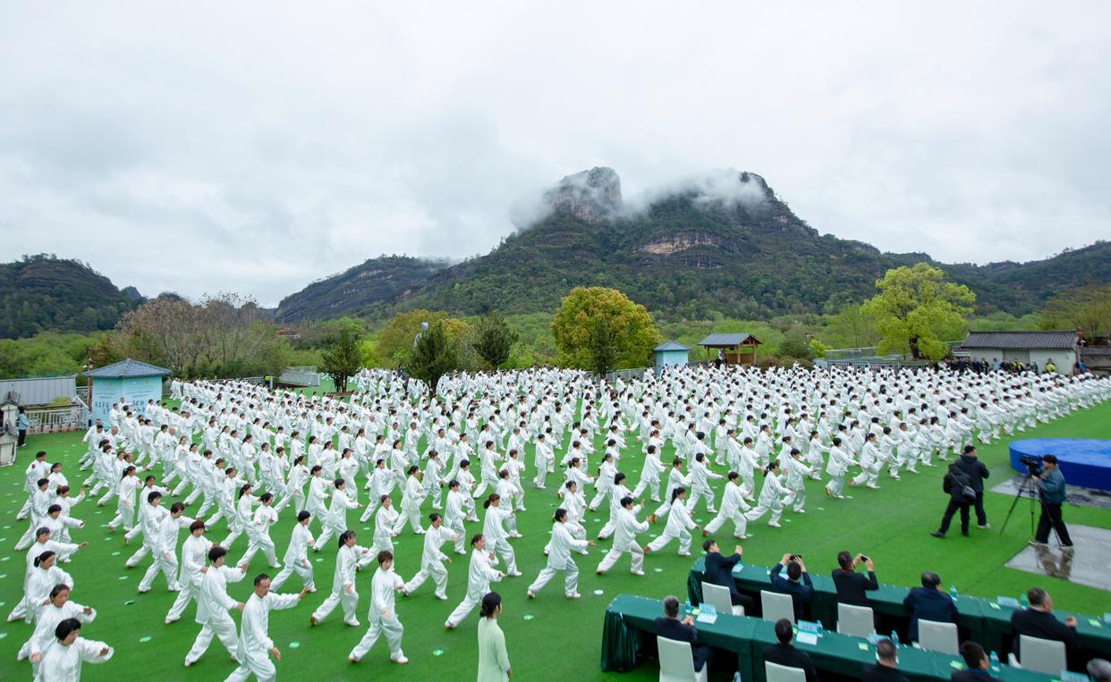 3月21日,在首个“国际太极拳日”太极拳展演活动主会场福建南平武夷山,太极拳爱好者展演太极拳。新华社发(陈颖 摄)
