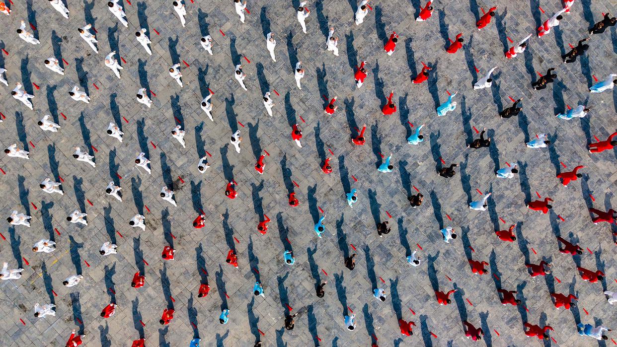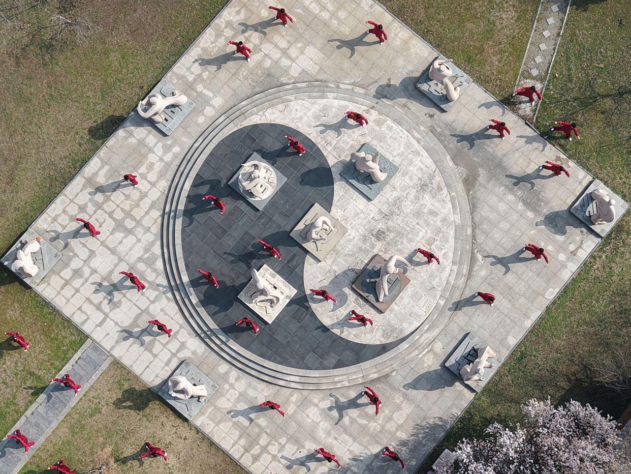 3月21日,在河南洛阳关林,太极拳爱好者进行太极拳展演(无人机照片)。新华社发(李卫超 摄)