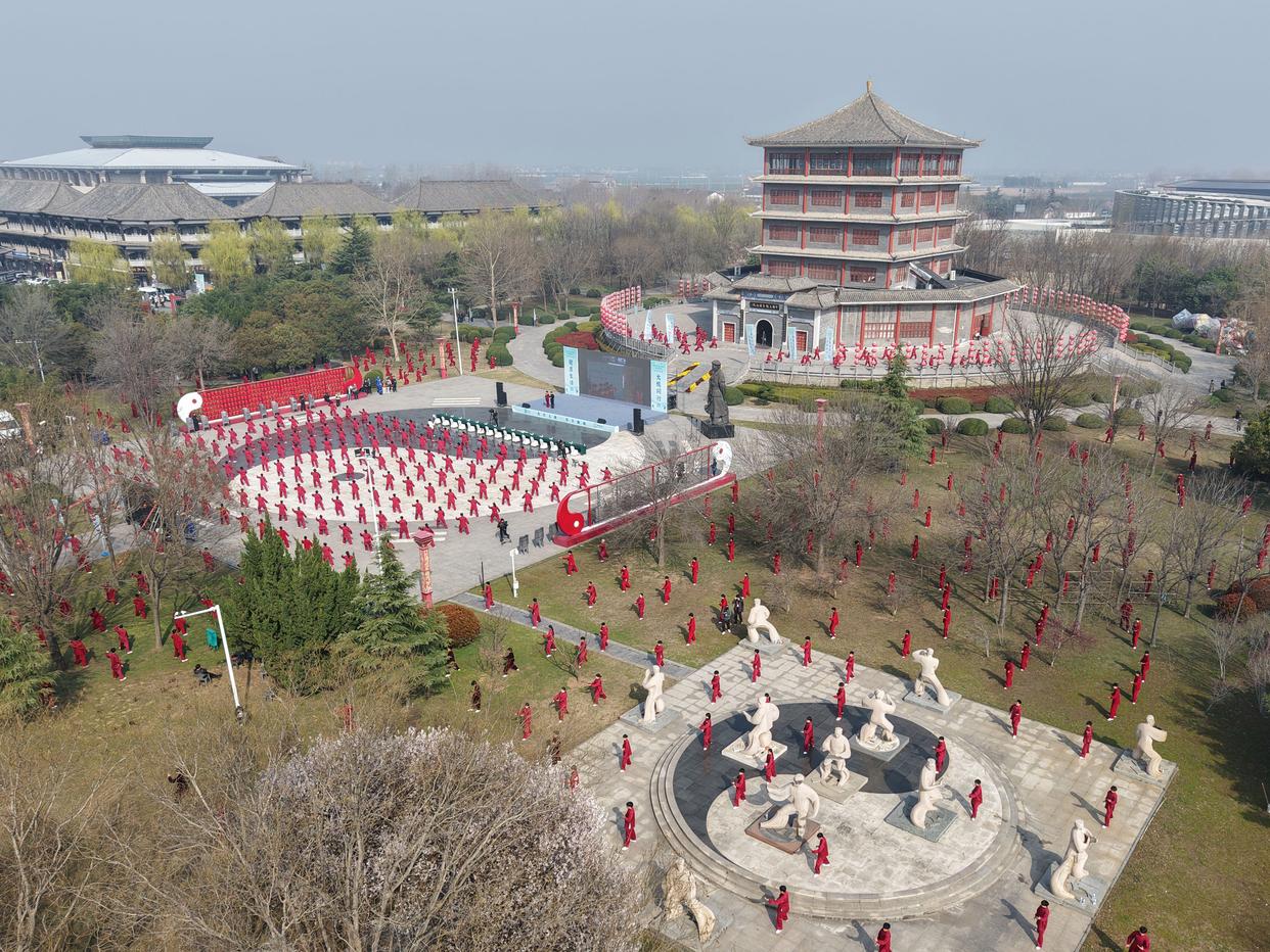3月21日,在首个“国际太极拳日”太极拳展演活动河南焦作分会场,太极拳爱好者在焦作温县中国太极拳博物馆前进行太极拳展演(无人机照片)。新华社发(徐宏星 摄)