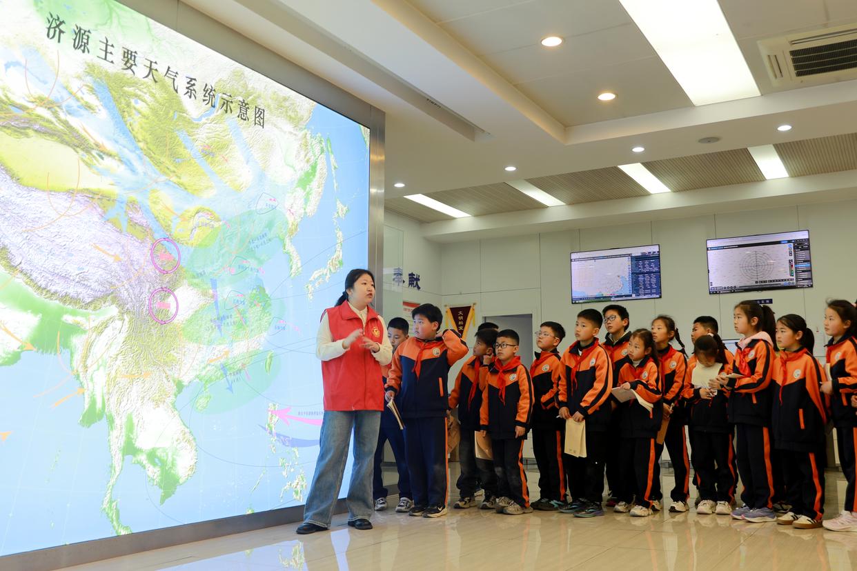 3月23日,在河南省济源市气象局开放日活动中,气象工作人员为小学生普及气象科普知识。新华社发(段二平摄)