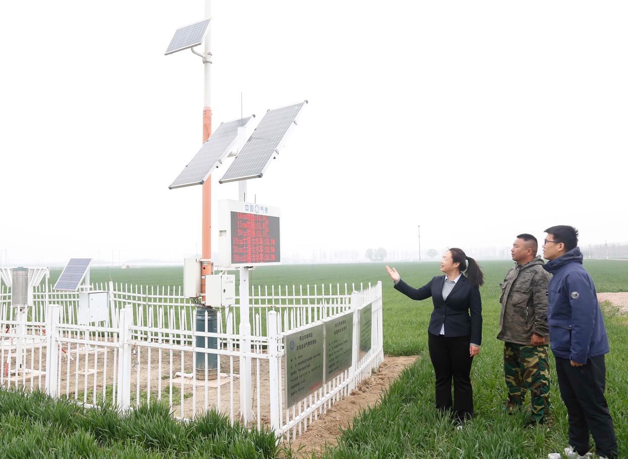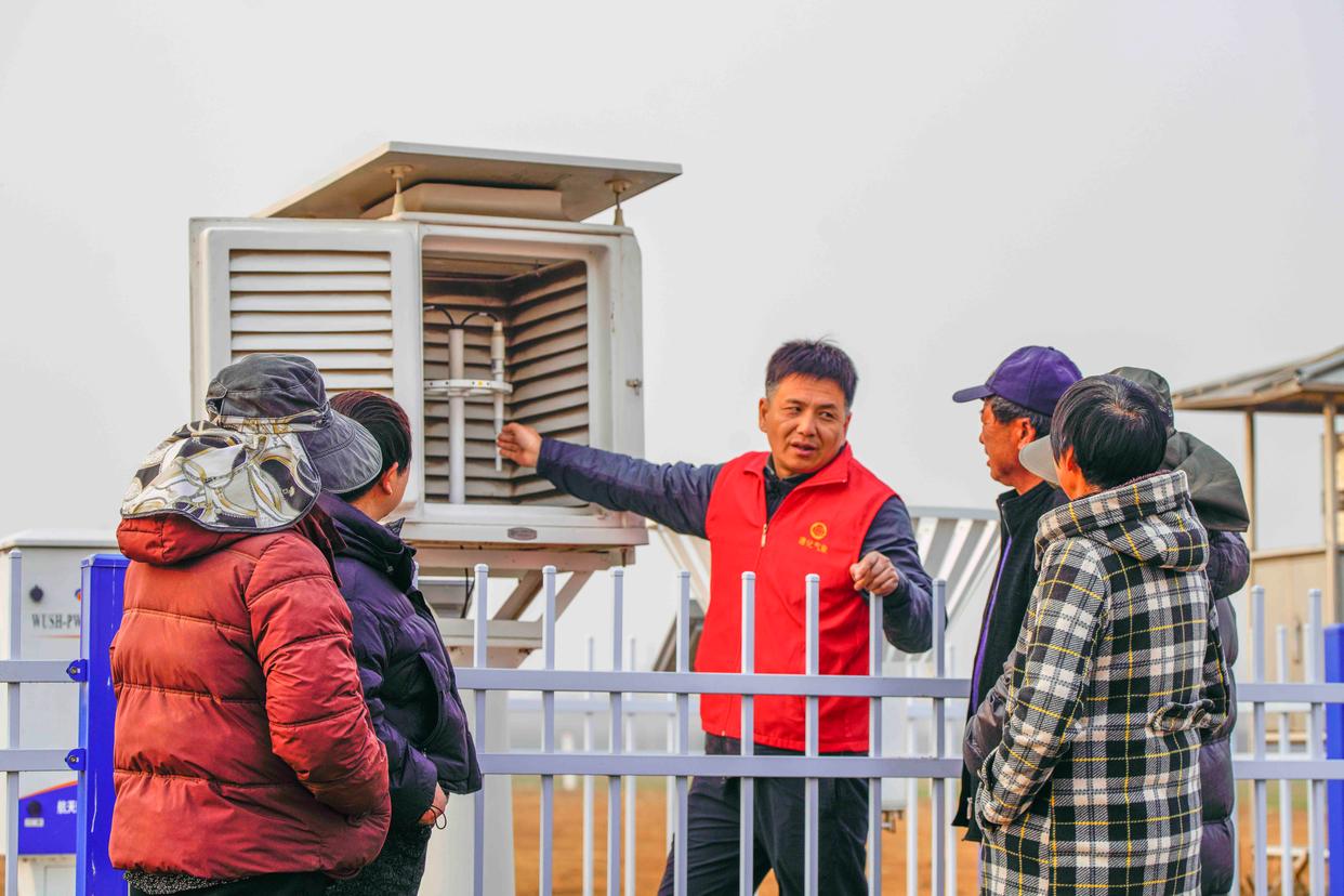 3月23日,河北省遵化市气象局的工作人员在农业气象监测站向农民讲解气象知识。新华社发(刘满仓摄)