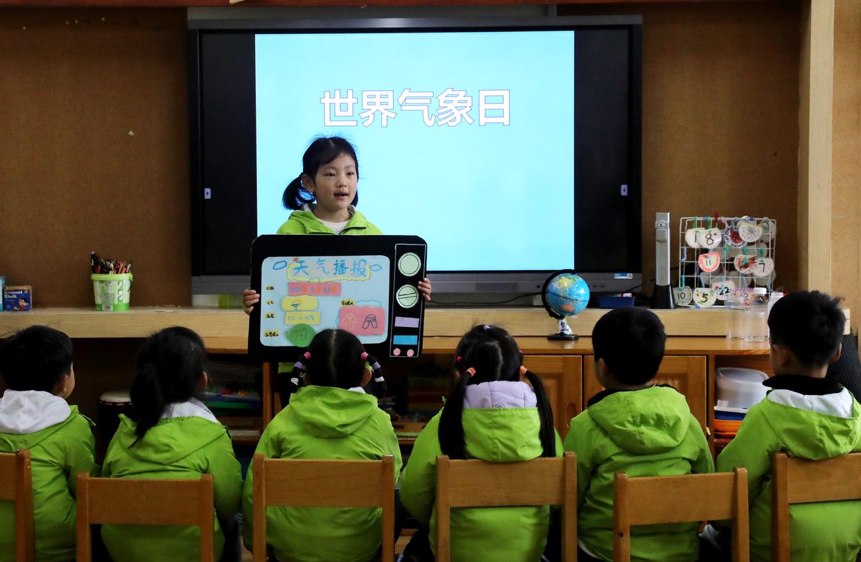 3月23日,在江苏省苏州市平江实验幼儿园,一名小朋友向同伴播报当天天气。新华社发(杭兴微摄)