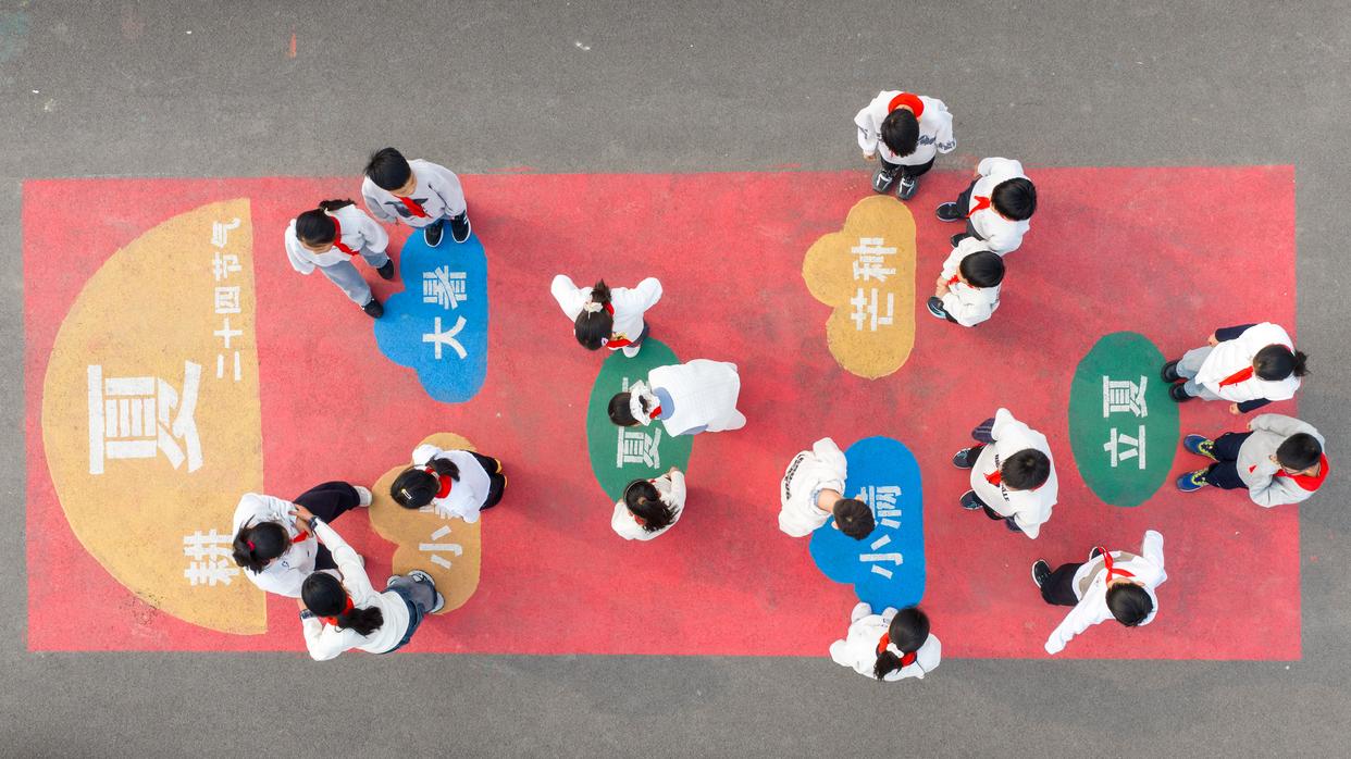 3月23日,在河北省唐山市丰南区岔河小学,学生参与二十四节气知识互动游戏(无人机照片)。新华社发(李秀清摄)