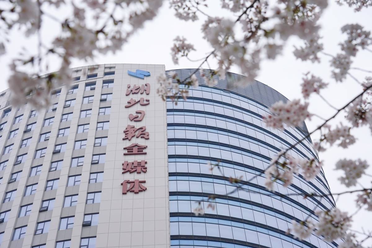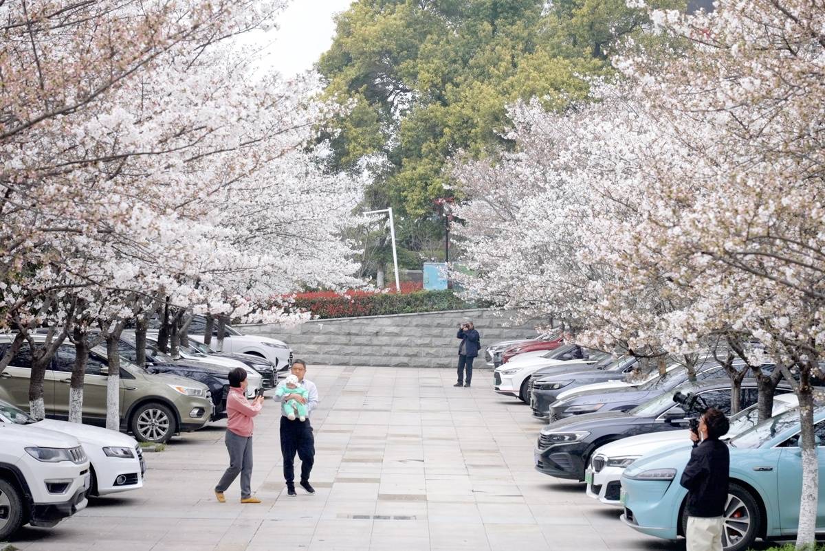 3月24日,楚天传媒大厦停车场内樱花盛放,不少路过的市民纷纷驻足,赏花拍照。(湖北日报全媒记者喻煜摄)