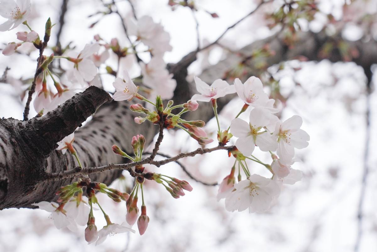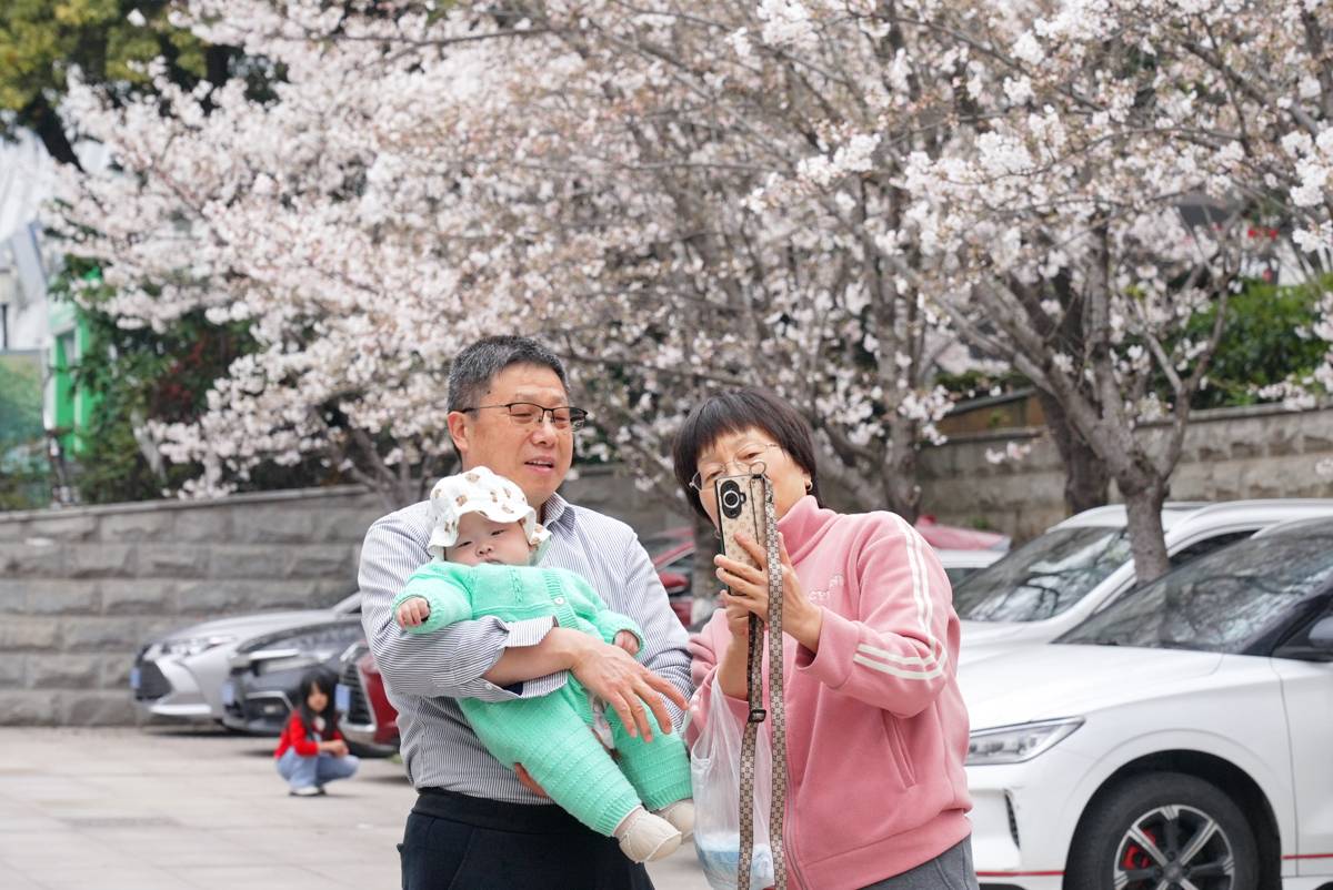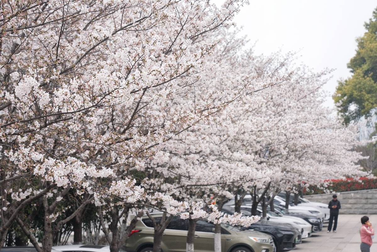 3月24日,楚天传媒大厦停车场内樱花盛放,不少路过的市民纷纷驻足,赏花拍照。(湖北日报全媒记者喻煜)