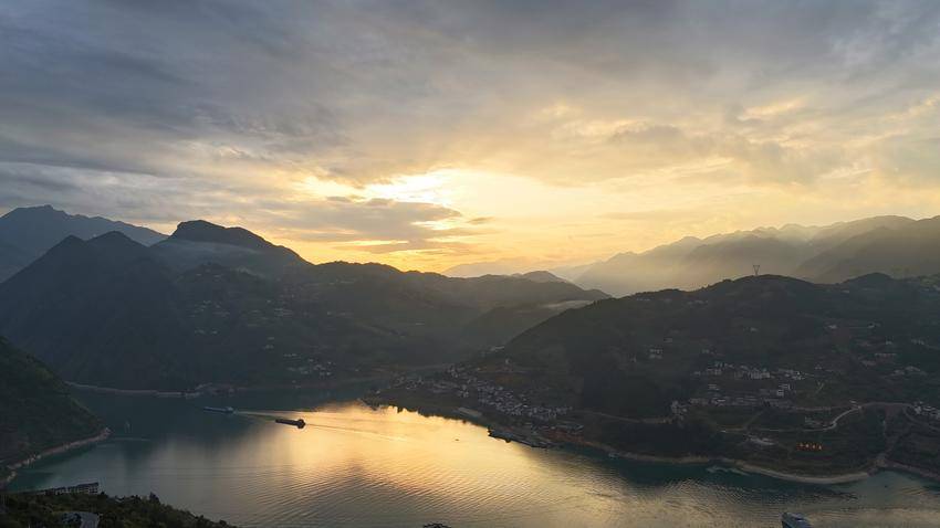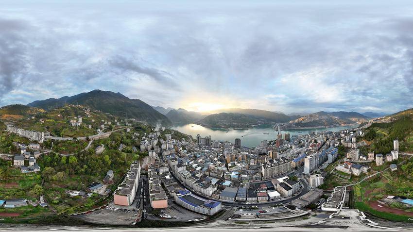 夕阳余晖洒落江面,原本碧绿的江水被镀上一层流动的金箔,波光粼粼,水天一色。整个县城沐浴在暖橙色的光芒中,鳞次栉比的楼宇披上霞衣,与天边残霞交相辉映。山水之城,在雨后暮色里静谧如画。