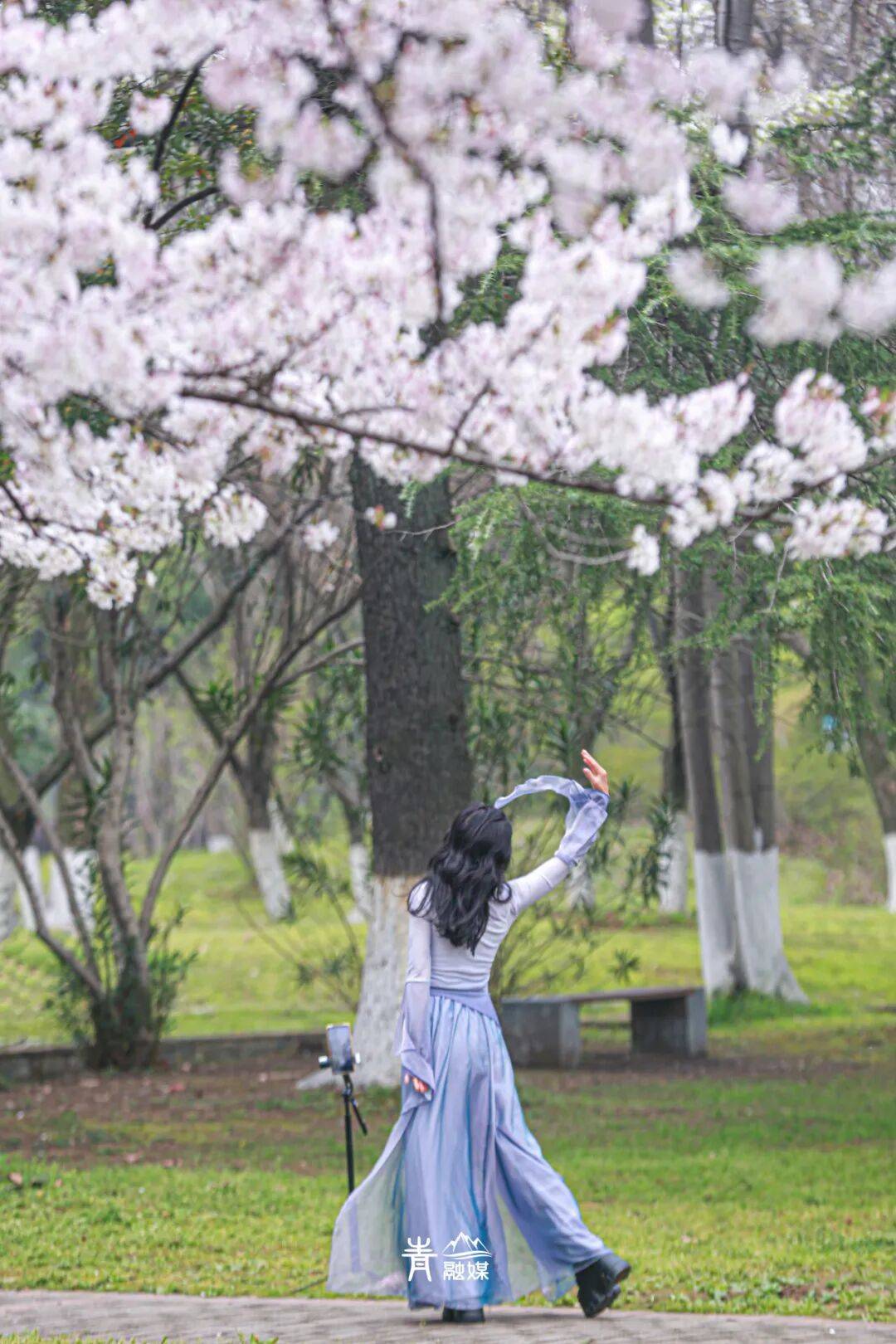 樱花树下,游人络绎不绝,却不失井然有序。身着cos服饰的爱好者漫步花海,灵动造型与粉白樱花相映,尽显青春活力;摄影爱好者驻足捕捉光影,用镜头定格樱花的绝美姿态;更有舞者驻足花下,舒展身姿、翩翩起舞,绝美舞姿与漫天樱花相映将春日的浪漫演绎到极致;还有远道而来的游客,静坐花下、打卡留念,感受青山春日的独特魅力。