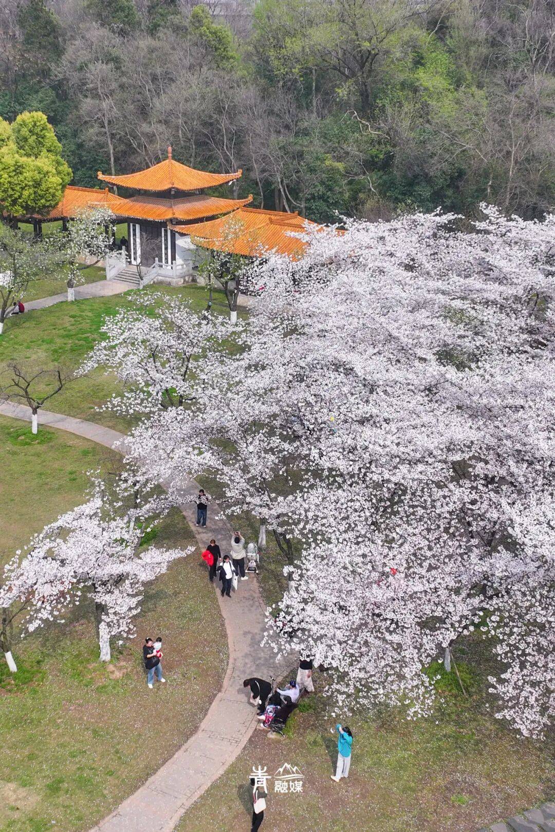 作为青山历史最悠久的公园,青山公园承载着几代青山人的记忆,园内培育有近700株樱花,集中分布于落樱缤纷景区的樱花苑,是青山人私藏的赏樱秘境。