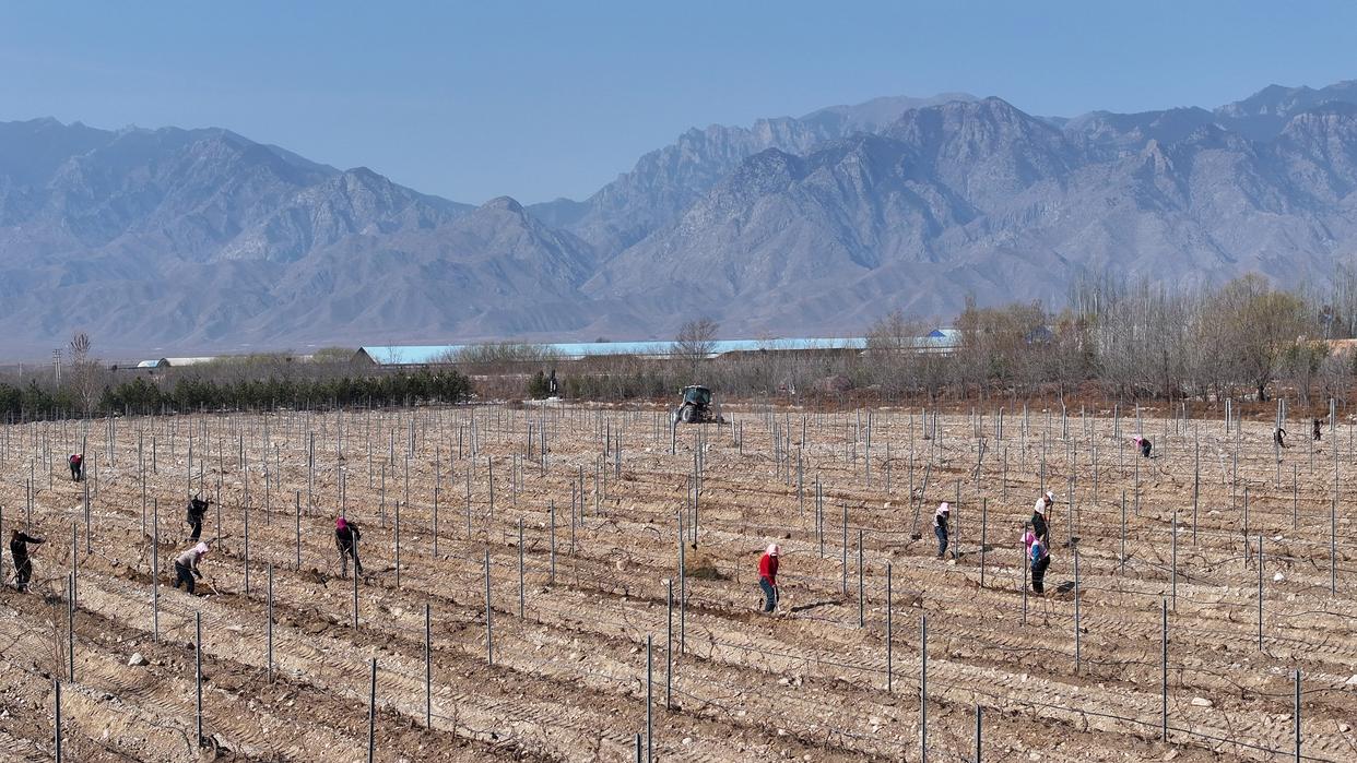 3月23日,工人在贺兰山东麓酿酒葡萄种植基地为葡萄展藤、培土(无人机照片)。新华社记者 王鹏 摄
