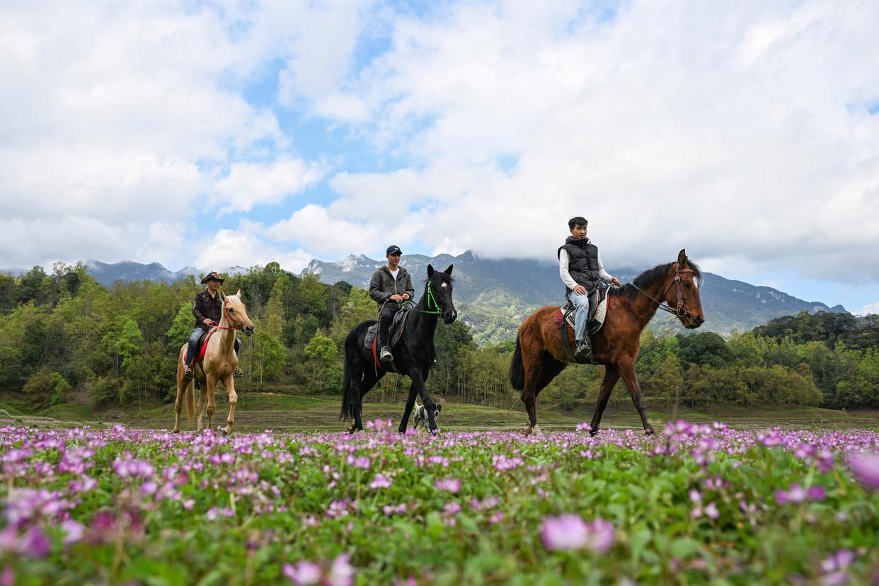 3月26日,游客在重庆市武隆区石桥苗族土家族乡八角村紫云英花海中骑马。新华社记者 陈诚 摄