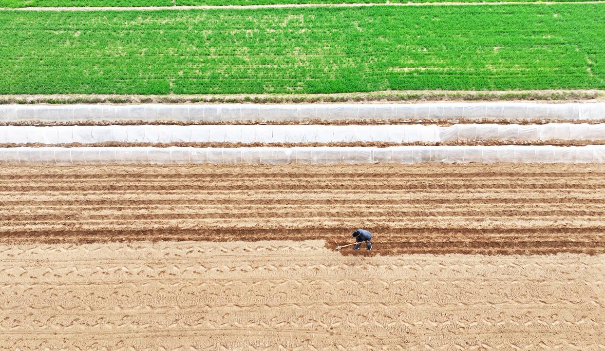 3月23日,山东省临沂市郯城县郯城街道,农民在田间劳作(无人机照片)。新华社发(张春雷摄)