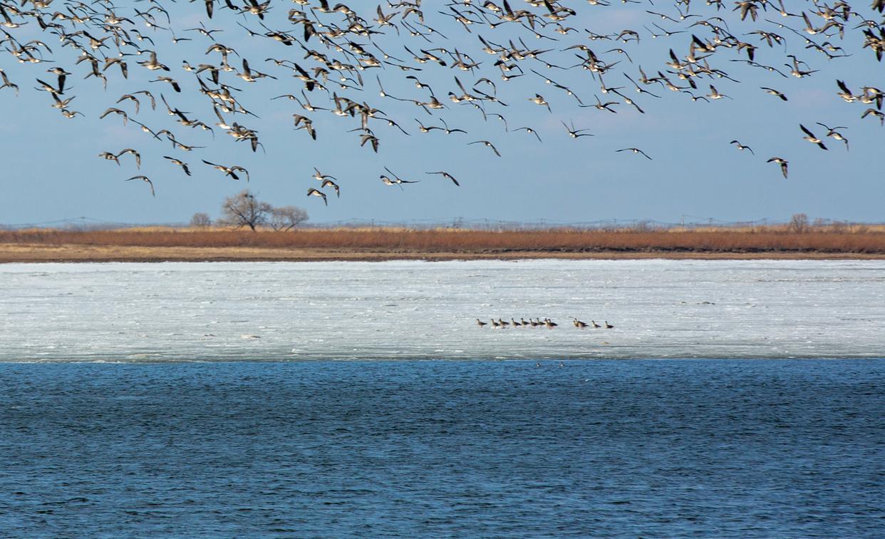 这是3月23日在松花江佳木斯段拍摄的大雁群。新华社发(陈志国摄)