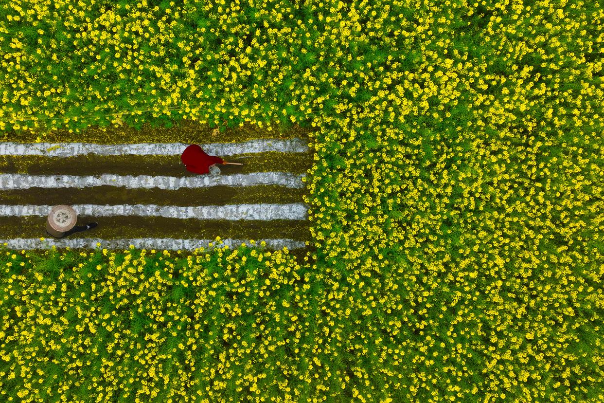 3月12日,游客乘船驶过重庆潼南崇龛花海景区(无人机照片)。新华社记者 王全超 摄