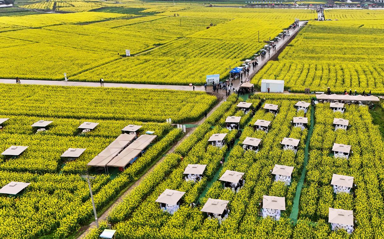 游客在四川省南充市蓬安县睦坝镇武胜村油菜花田里体验“花田席”(3月13日摄,无人机照片)。新华社发(刘永红摄)“十五五”开局之春