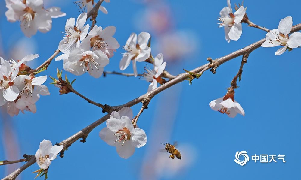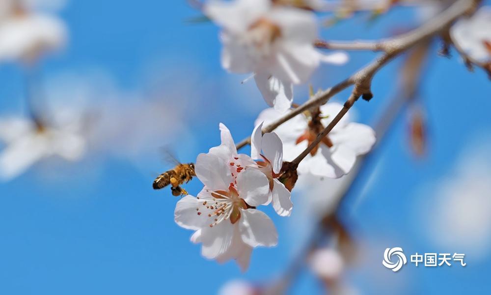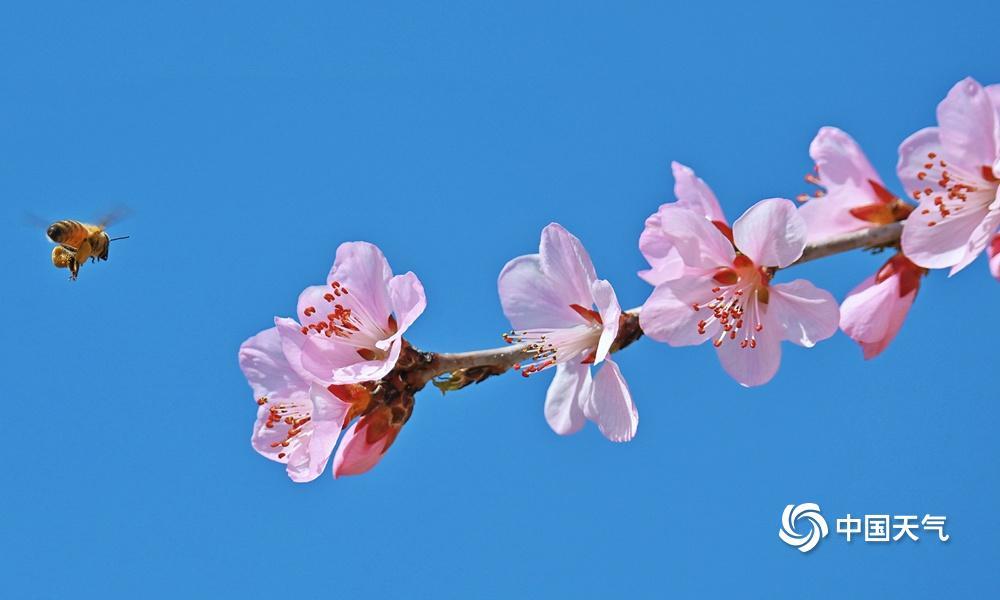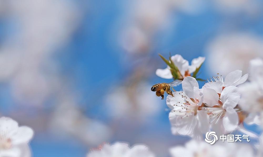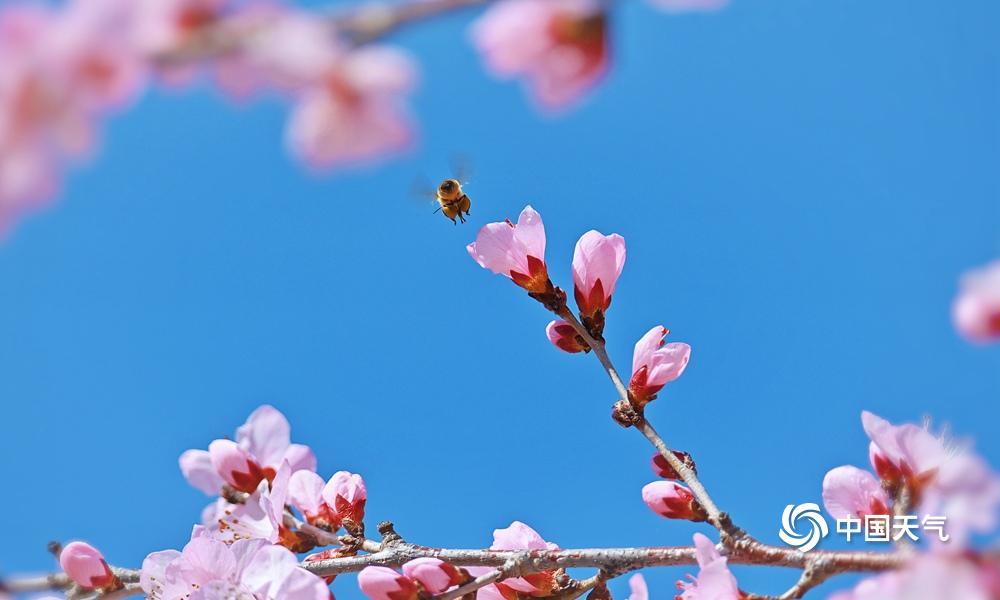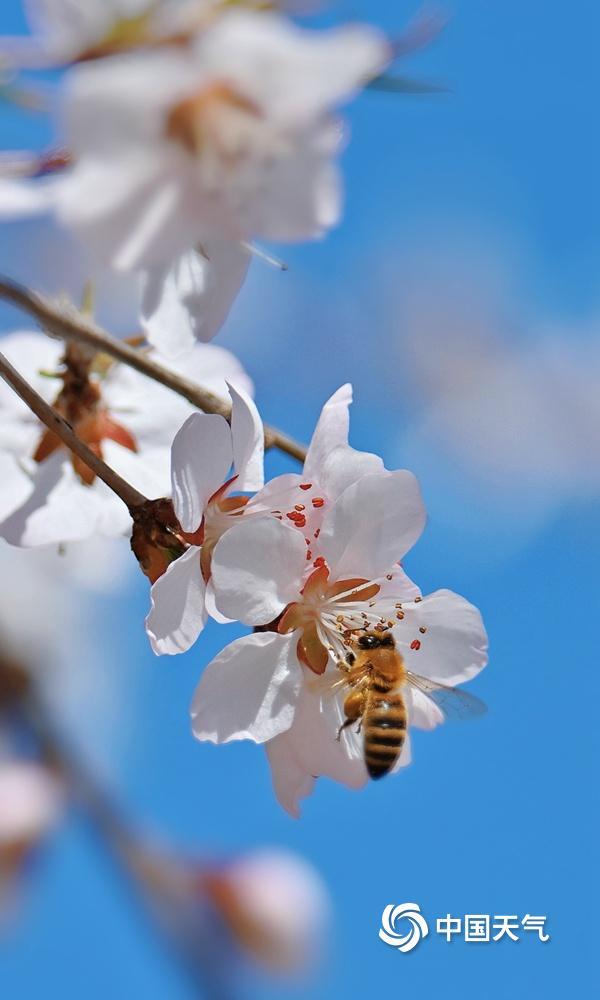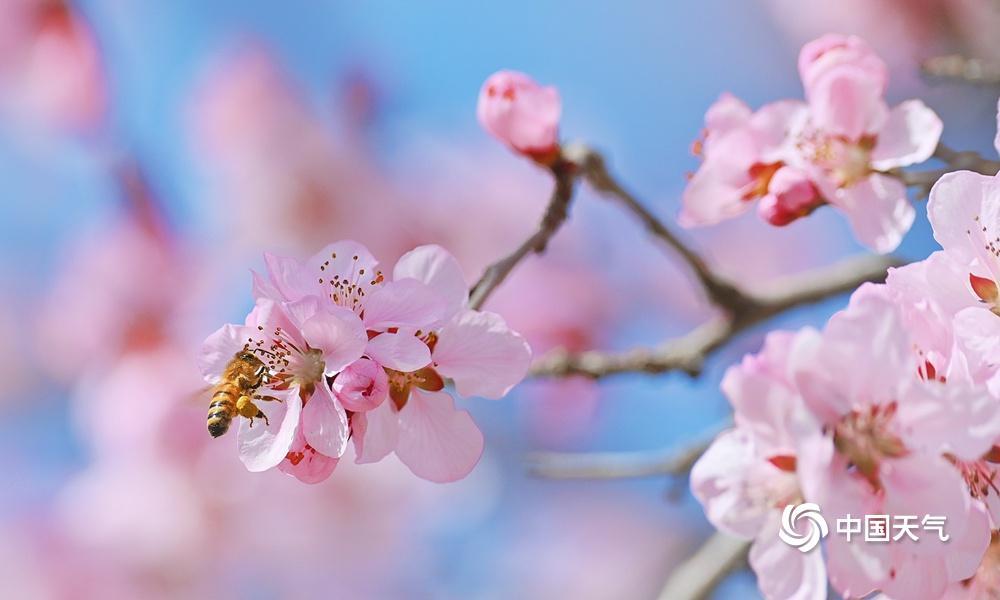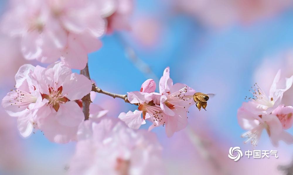 蓝粉配色是春天的配色!近日,北京阳光在线,春色渐浓,樱花绽放,粉嫩的花朵吸引小蜜蜂前来采蜜。