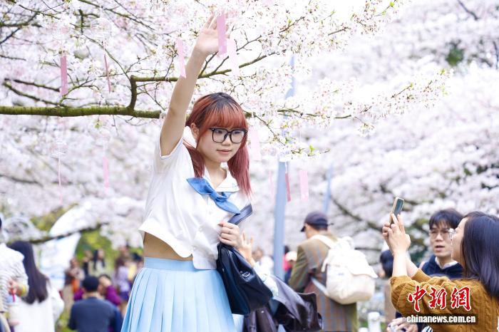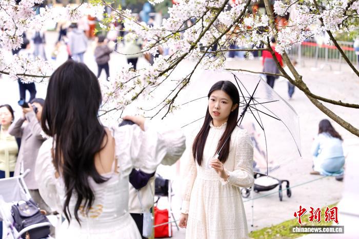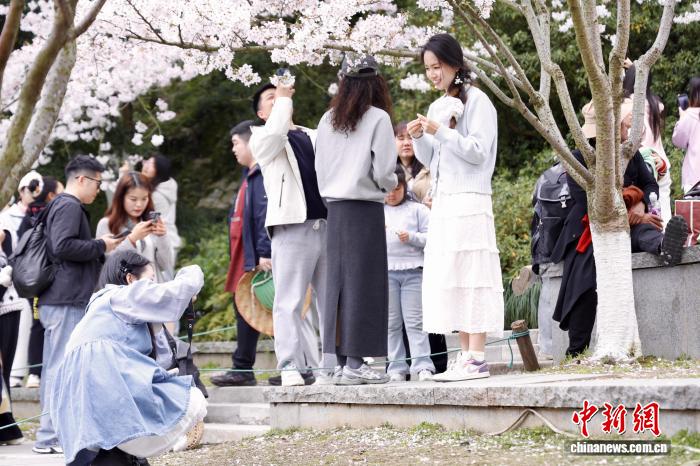 3月28日,浙江杭州,游人与樱花合影留念。近日,杭州少年儿童公园内樱花盛开,赏樱游人络绎不绝。 中新社 记者 肖健 摄