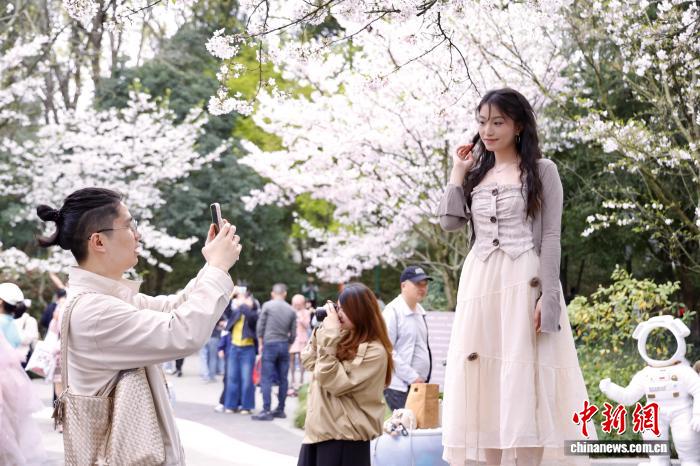 3月28日,浙江杭州,游人与樱花合影。近日,杭州少年儿童公园内樱花盛开,赏樱游人络绎不绝。 中新社 记者 肖健 摄