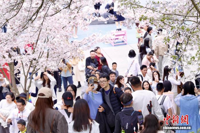 3月28日,浙江杭州,游人打卡樱花。近日,杭州少年儿童公园内樱花盛开,赏樱游人络绎不绝。 中新社 记者 肖健 摄