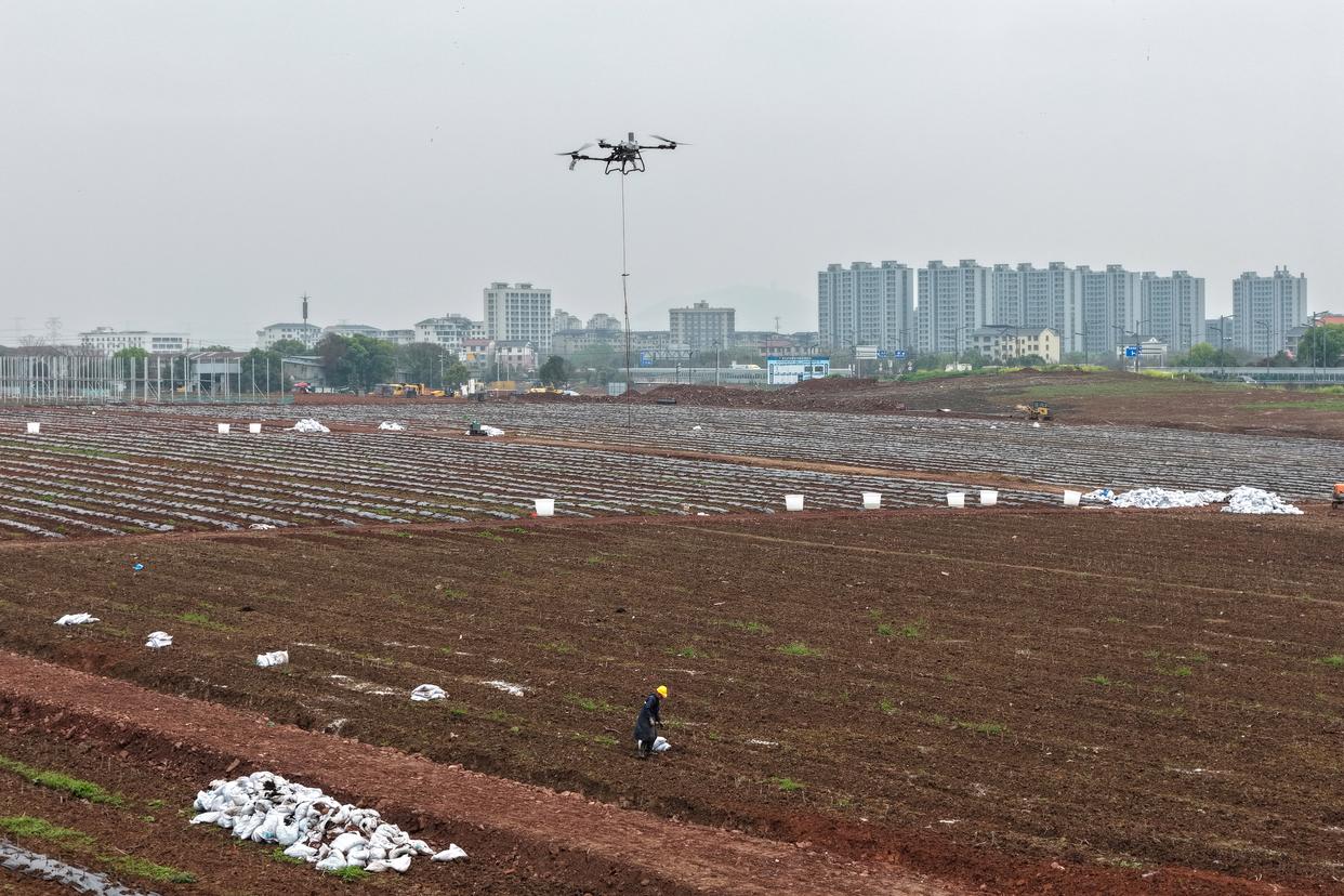 3月27日,浙江省金华市金东区东孝街道农民在田间使用农用无人机搬运有机肥(无人机照片)。新华社发(时宽兵 摄)