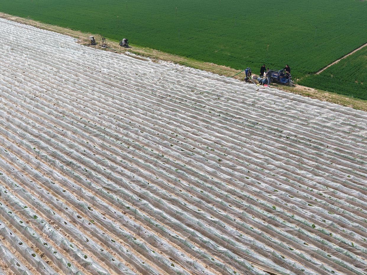 3月27日,浙江省金华市金东区东孝街道农民在田间覆盖地膜(无人机照片)。新华社发(时宽兵 摄)