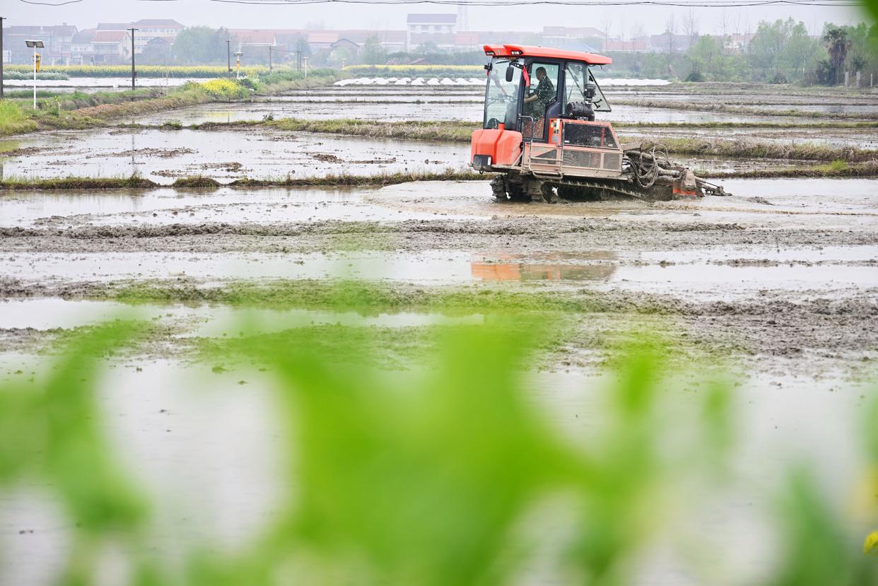 3月29日,在湖南省常德市澧县梦溪镇梦溪寺社区,农民驾驶耕整机械整理稻田。新华社发(柏依朴 摄)